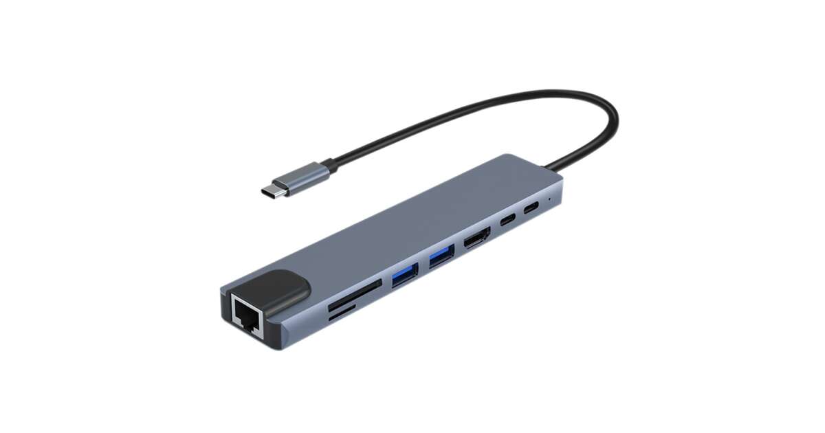 Hub Adapter 8 az 1-ben, BLEKSY®, USB-C-HDMI 4K/30Hz, 1 x LAN RJ45 100 Mbs, 1 x USB-C, 1 x USB 3.0, 1 x USB 2.0, 1 x tápellátás 87 W, kártyaolvasó TF /SD, dokkoló állomás MacBook Air/Pro és la