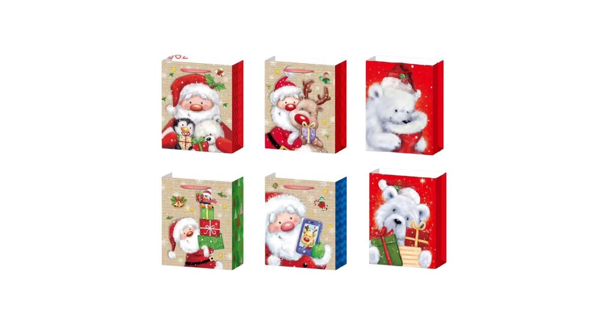 Ezt a terméket így is ismerheted: 6 db-os ajándéktasak készlet, KeepHome, nyomtatott témájú Mikulás és mackó, véletlenszerű minta, papír, egyszerű ajándékcsomagolás, 18,5x22,5x8,5 cm, többszínű