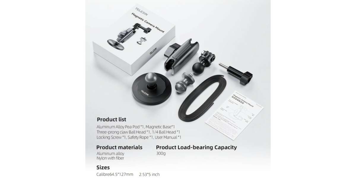 Mágneses tapadókorong, Telesin CMM-001, állítható kar, kompatibilis GoPro Hero 12,11,10,9,8,7,6, DJI Osmo Action 3/2, Insta 360 X3, Insta 360 X4 leírása