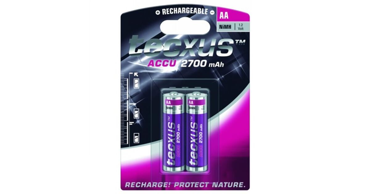 Két darab Tecxus 2700 mAh kapacitású, AA méretű, újratölthető nikkel-fémhidrid (NiMH) akkumulátor. Ideális választás minden olyan eszközhöz, amely AA elemeket használ, és környezettudatos megoldást keresel.