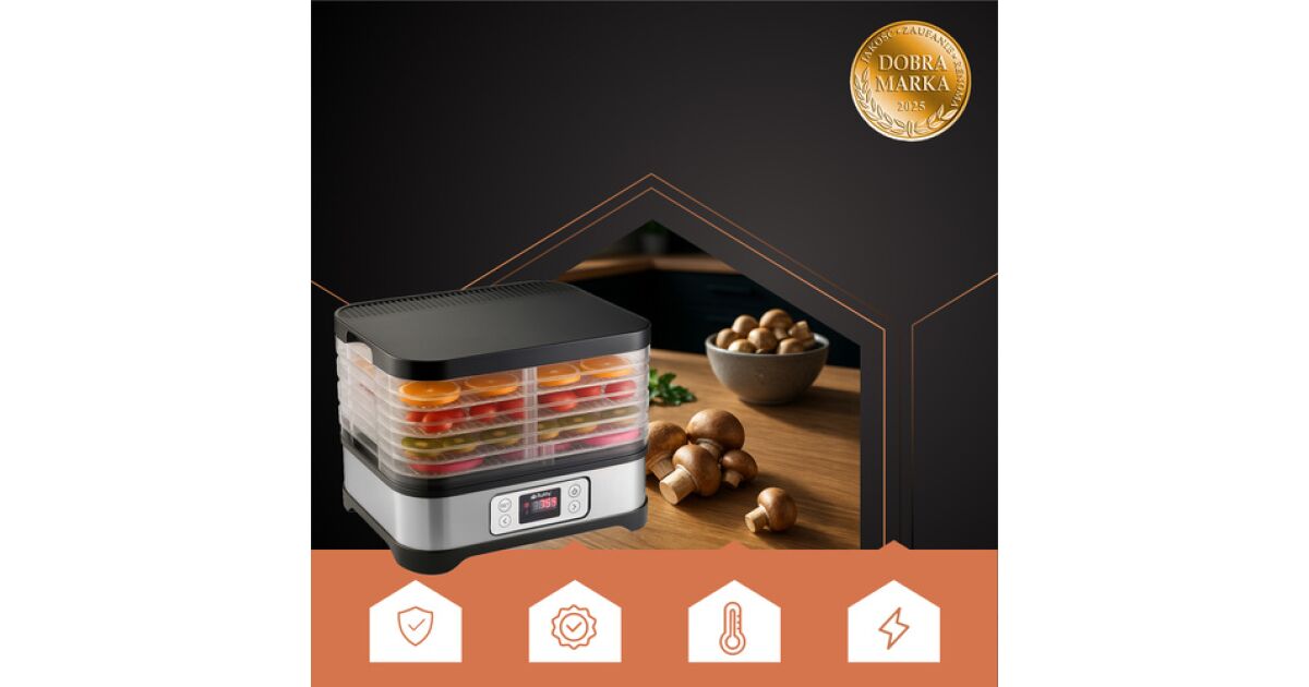 Az univerzális 400 W-os szárítógép lehetővé teszi gombák, gyümölcsök, zöldségek és fűszernövények szárítását - 5 tálcával rendelkezik, összesen 10 literes kapacitással, állítható hőmérséklettel (35-70 °C) és egy jól látható LCD kijelzővel, akár 24 órás programozási lehetőséggel.