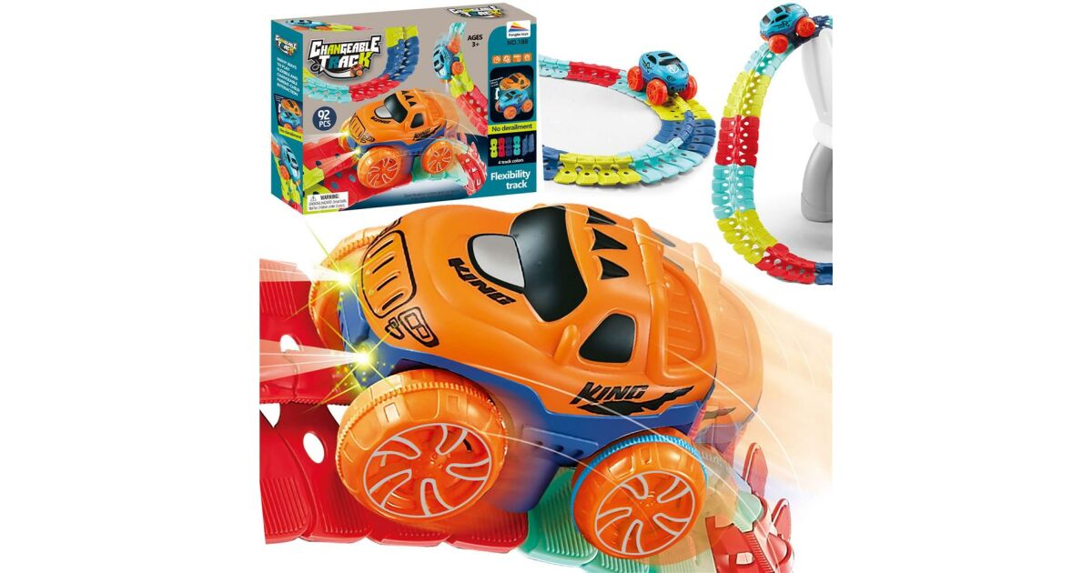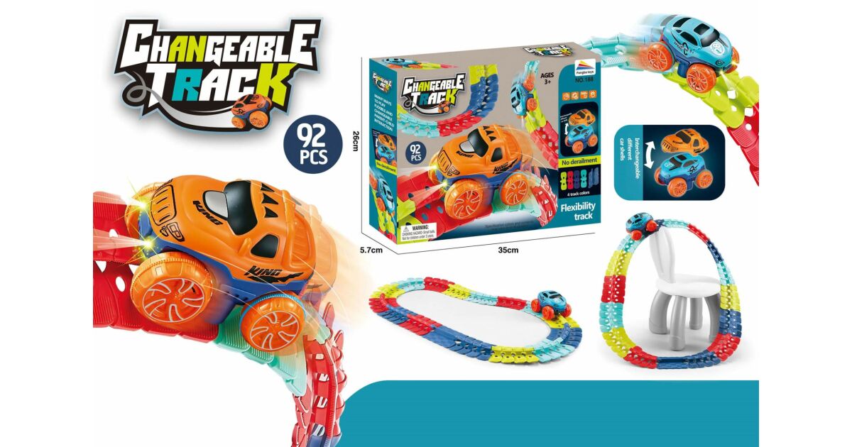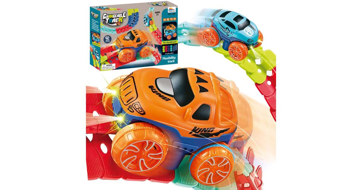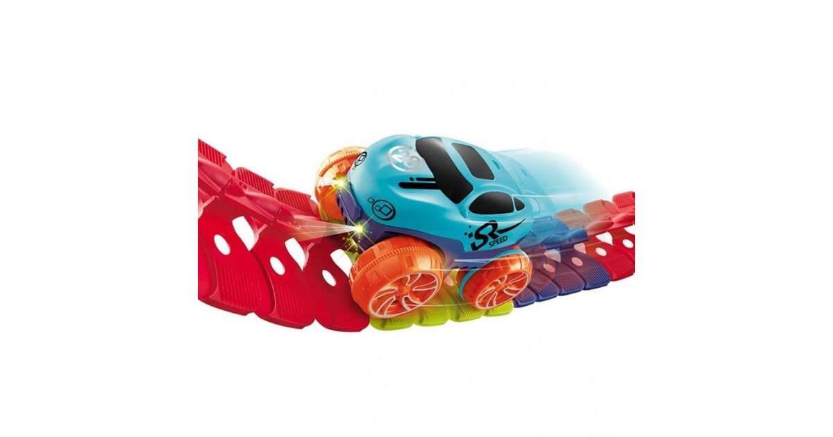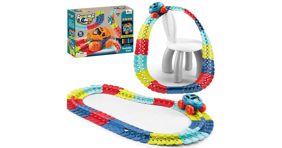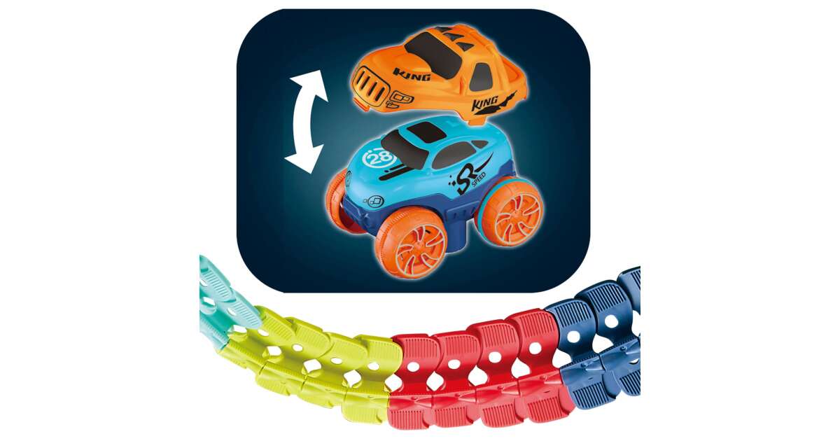 Ez a 92 darabos flexibilis versenyautópálya hajlik, világít és garantáltan órákon át tartó szórakozást nyújt! A pályán található LED lámpák fényesen világítanak, amikor az autó áthalad rajtuk, fokozva a játék élményét.
