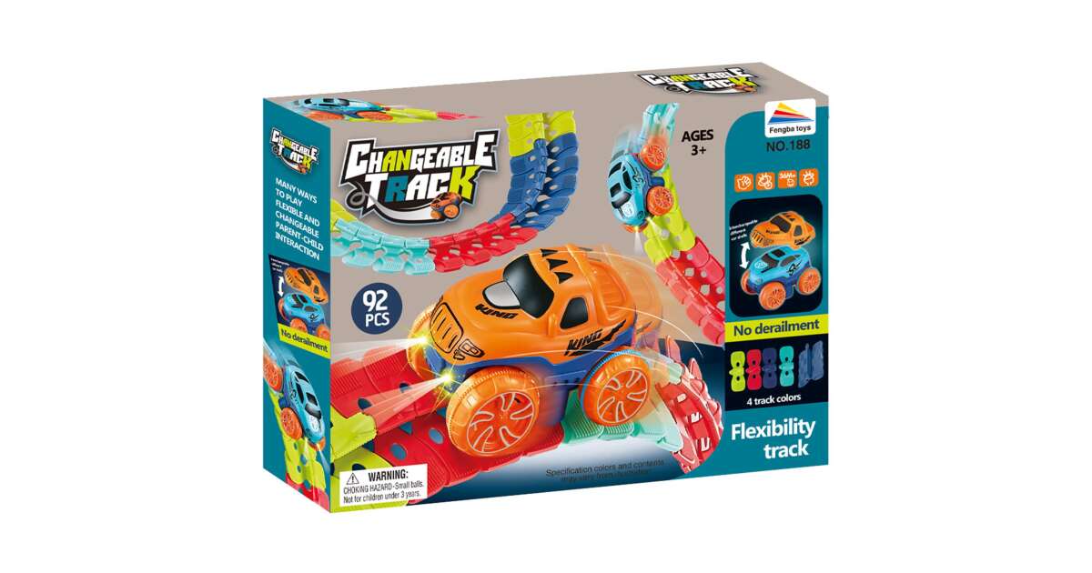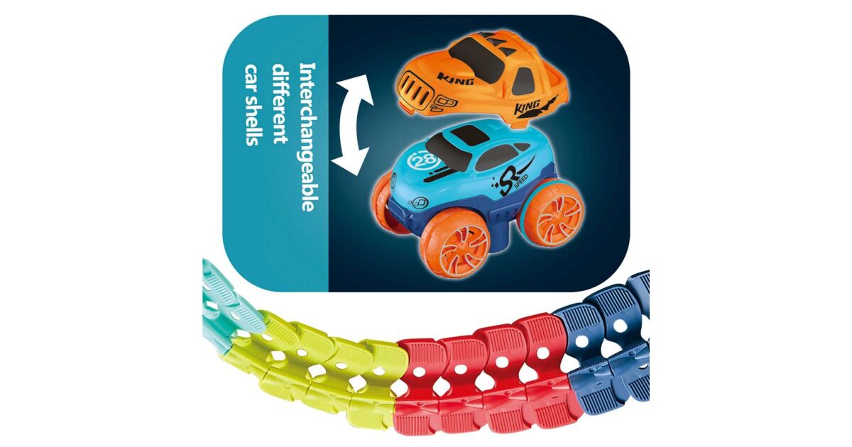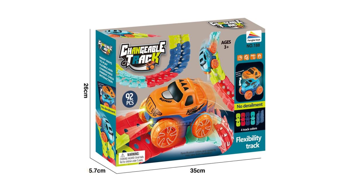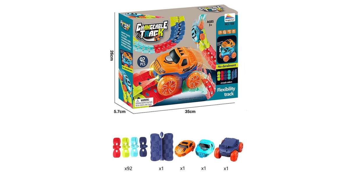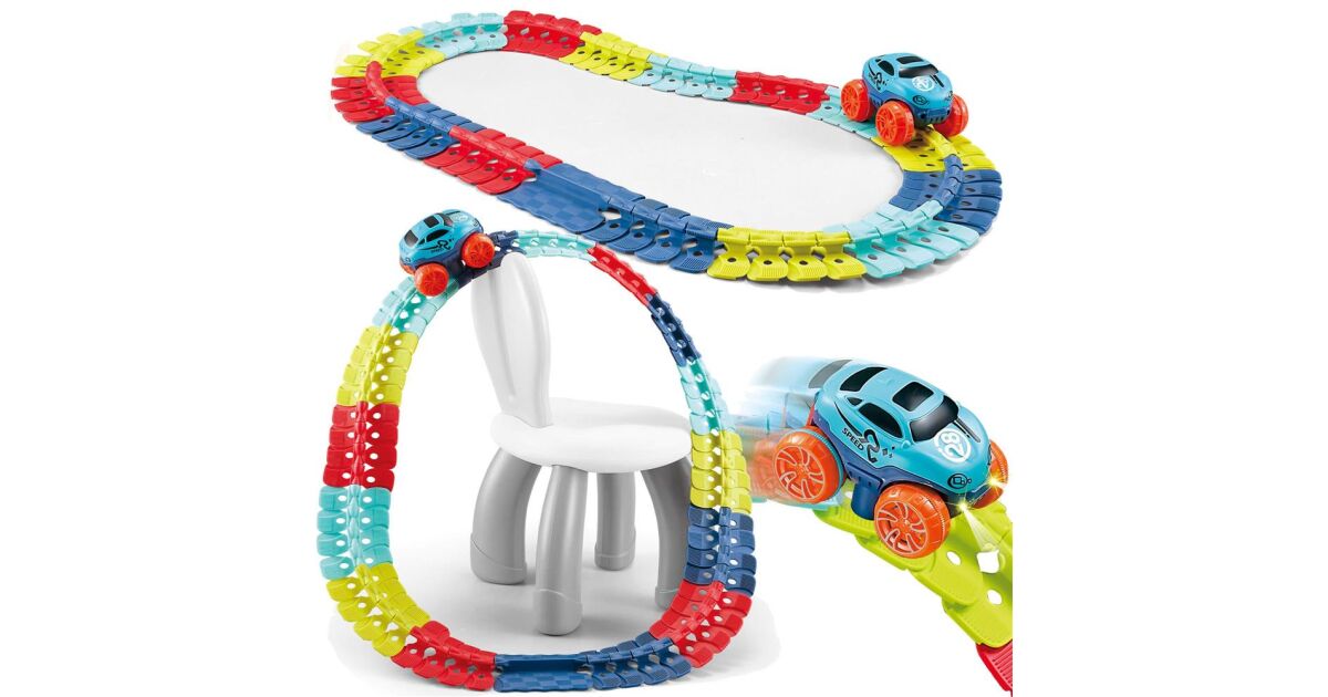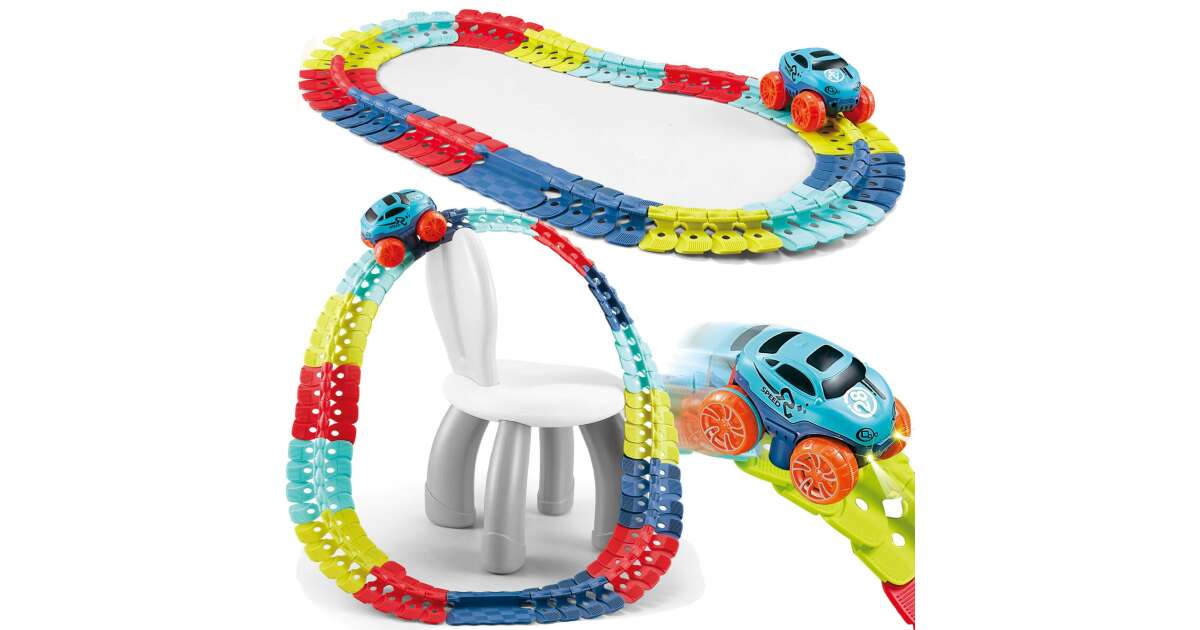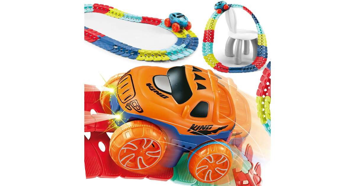 Ez a 92 darabos flexibilis versenyautópálya hajlik, világít és garantáltan órákon át tartó szórakozást nyújt! A pályán található LED lámpák fényesen világítanak, amikor az autó áthalad rajtuk, fokozva a játék élményét.