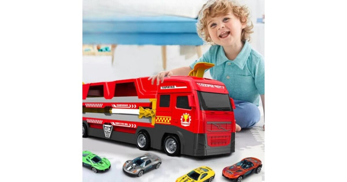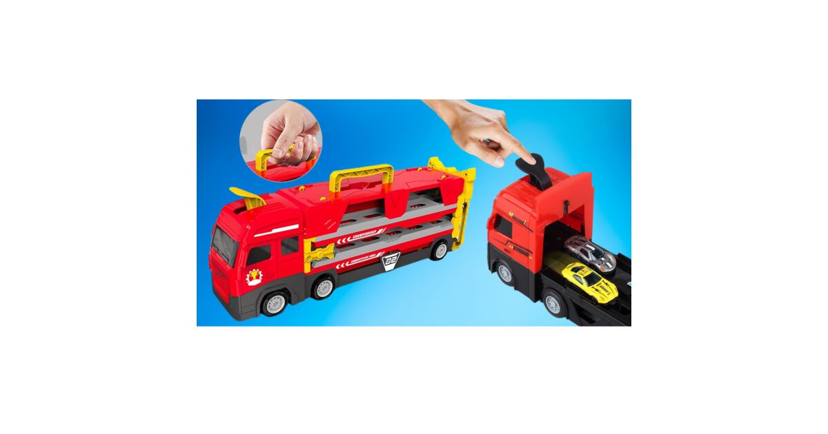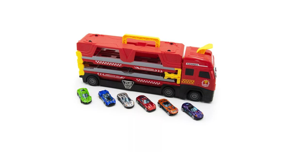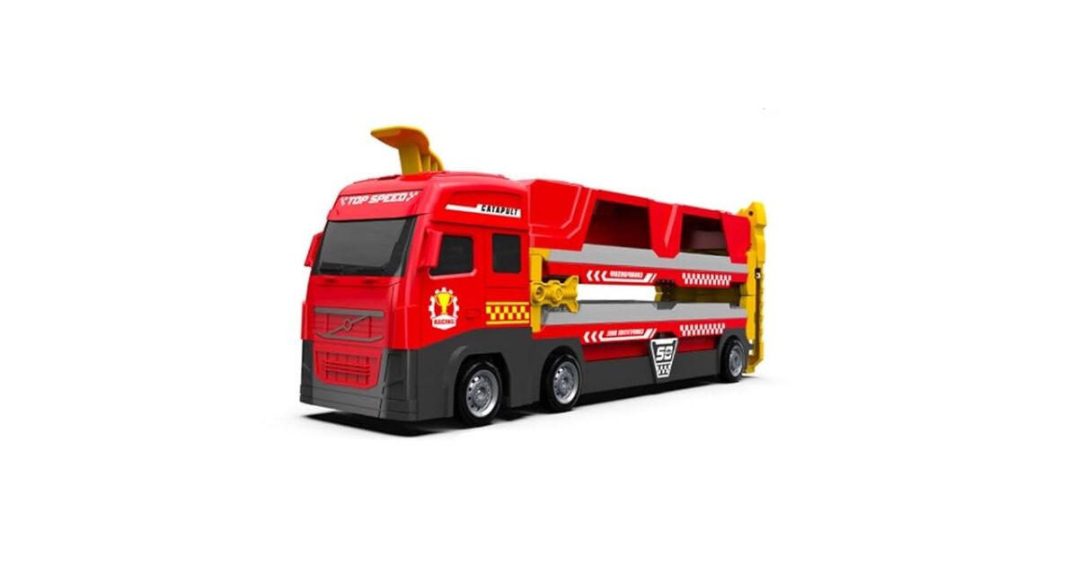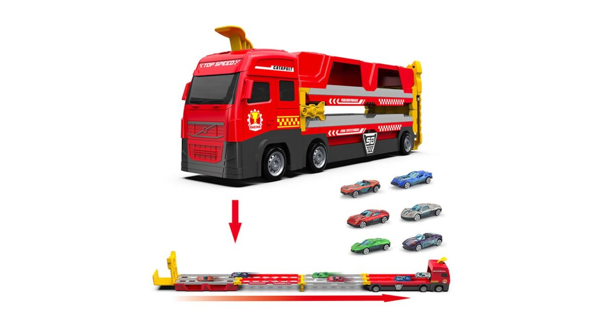 Ezt a terméket így is ismerheted: Autószállító játék kamion és kilövőállomás - beépített, 152cm-es, 2 sávos versenypályával és 6 db kisautóval