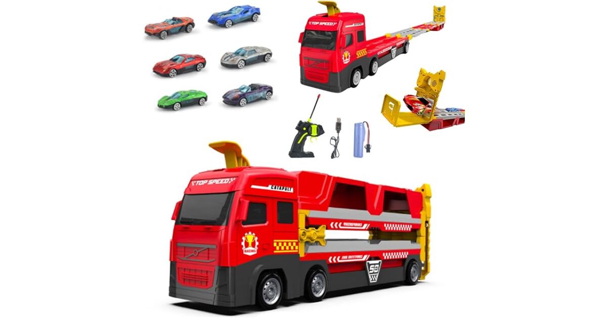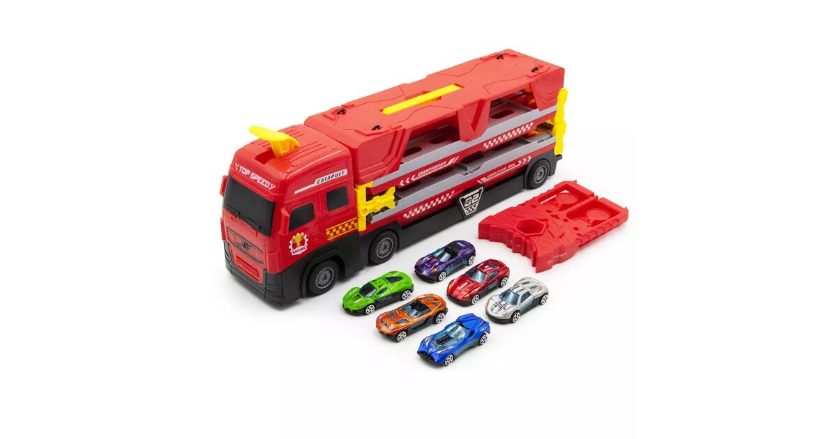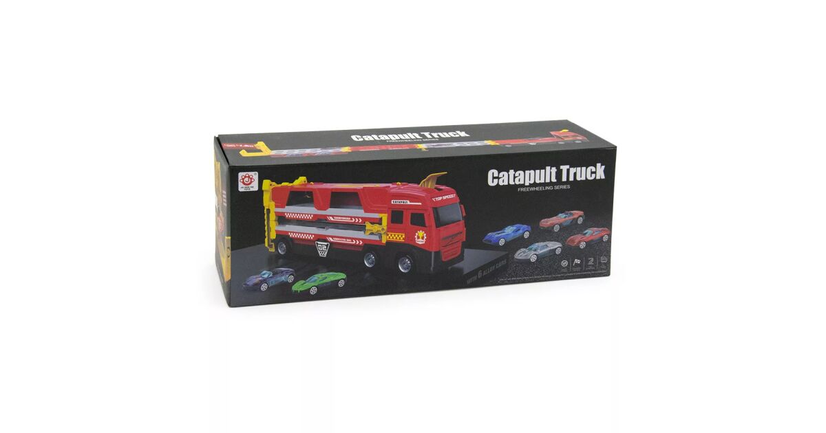 Ez a fantasztikus autószállító kamion 152 cm hosszú kinyitható versenypályával érkezik, 6 db kisautóval és egy izgalmas katapult kilövővel! Készülj fel órákig tartó szórakozásra és izgalmas versenyekre!