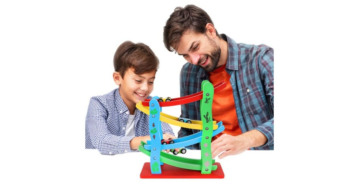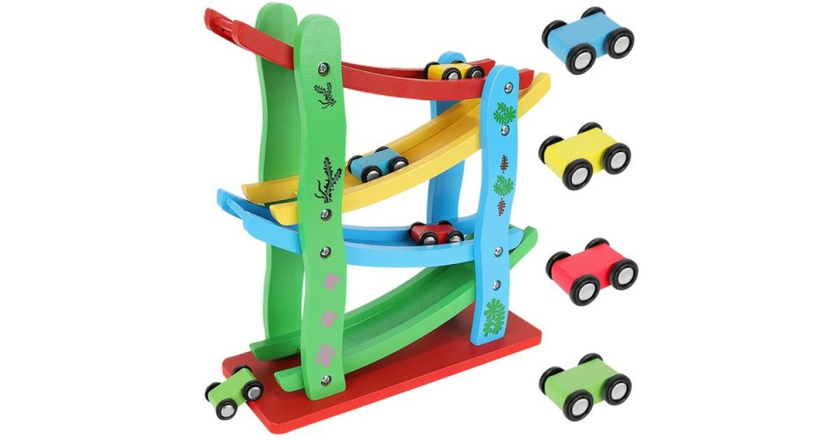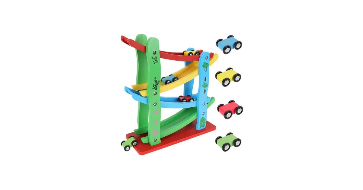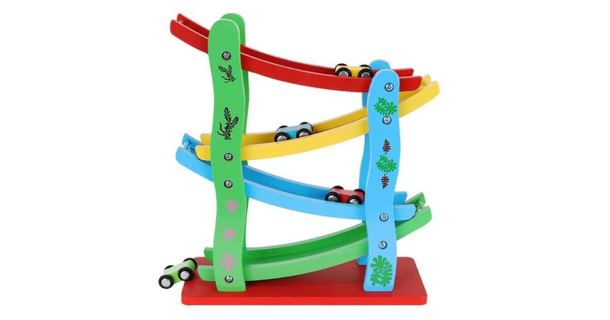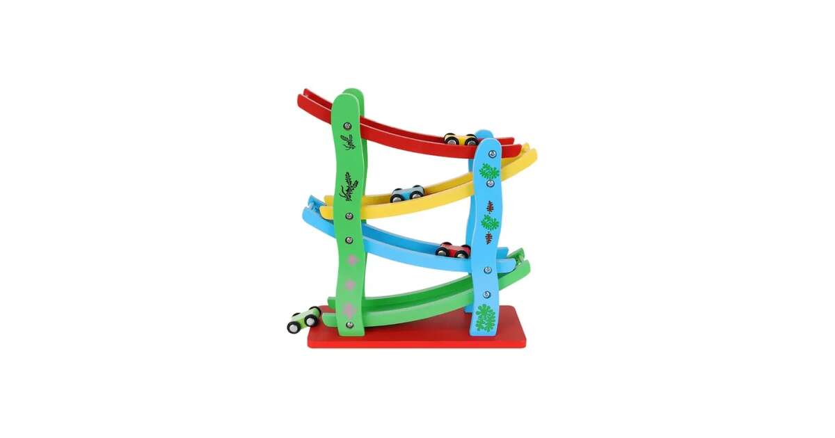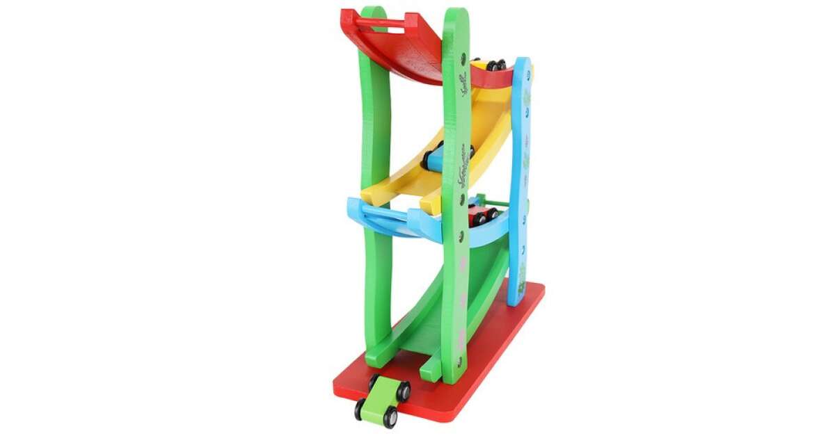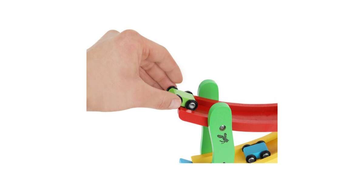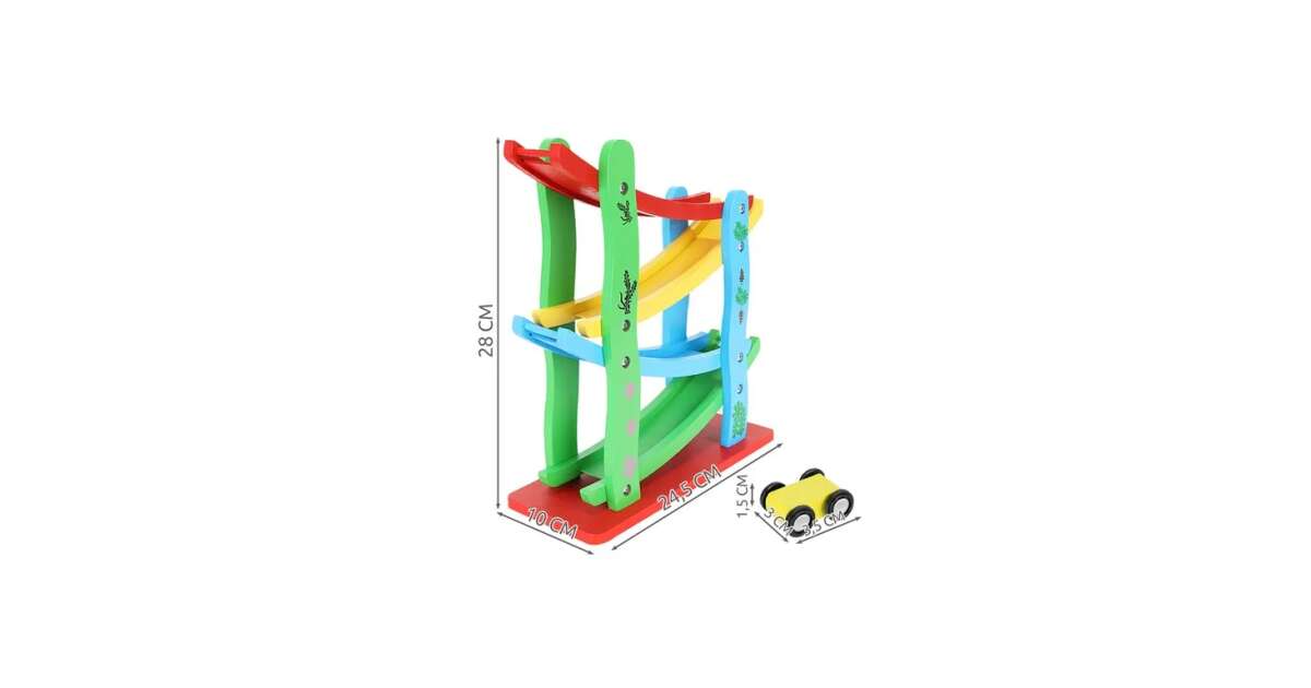 Az autós csúszdának 4 szintje van, így 4 versenypálya is , mindegyik más-más színben. Ha az autót a legmagasabb sínre helyezi, a gyermek megnézheti, ahogy lecsúszik az aljára.