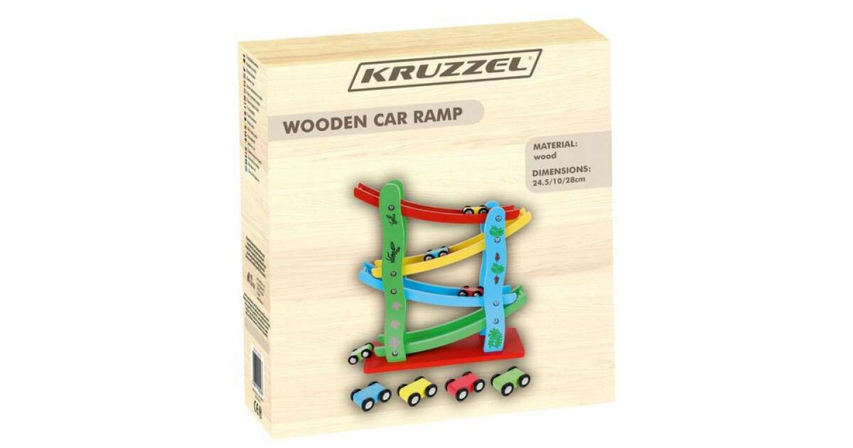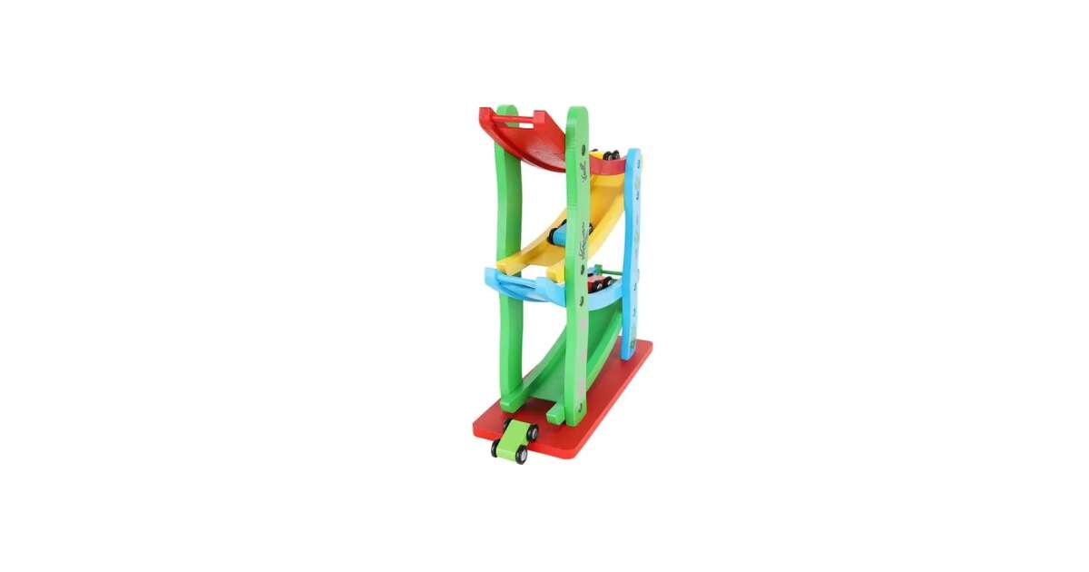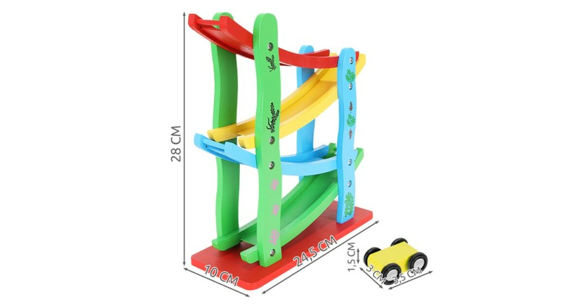FA Csúszda - PÁLYA AUTÓKHOZ 5 ELEM A KÉSZLETBEN - a játék 5 elemből áll: egy csúszda 4 pályával és 4 autóval (zöld, kék, piros és sárga). Az egész fából készült, és gyerekekre ártalmatlan festékkel van festve. Biztonságos és környezetbarát alternatívája a műanyagból készült játékoknak . FÁBÓL KÉSZÜLT - a fajátékok időtlen ajánlat, amely minden kisgyermeknek örömet okoz. A fa klasszikus szépsége és tartóssága mindig is nagyra értékelték. Ez az alapanyag natúr színben és festve is jól mutat. BIZTONSÁGOS EGÉSZSÉGÜGY - köszönhetően a csúszda fából készült, minden gyermek számára biztonságos. A természetes alapanyag azt jelenti, hogy még ha a gyerek a szájába veszi is a játékot, nem érintkezik mesterséges anyagokkal. Nincsenek rajta kiálló, éles elemek, amelyek károsítanák a gyermeket . FEJLŐDIK - egy fa csúszda tökéletesen betölti az oktatási szerepet. Fejleszti a finommotorikát és a kézi készségeket. Gyermeke megtanulja felismerni a színeket és 4-ig számolni, valamint megtanulja az ok-okozati összefüggést azáltal, hogy az autókat pályára állítja . MŰSZAKI ADATOK - anyaga: fa; csúszda méretei: 24,5 x 10 x 28 cm; készlet súlya: 630 g; súlya csomagolással: 790 g. LEÍRÁS anyaga: fa csúszda méretei: 24,5 x 10 x 28 cm készlet súlya: 630 g súlya csomagolással: 790 g TARTALOM csúszik 4 autó Az autós csúszdának 4 szintje van, így 4 versenypálya is , mindegyik más-más színben. Ha az autót a legmagasabb sínre helyezi, a gyermek megnézheti, ahogy lecsúszik az aljára. A játék úgy lett megtervezve, hogy a gyerek egyszerre 4 járművet tudjon elengedni egymás után. Játék közben megcsodálja a csúszó autók sebességét és akrobatikáját.