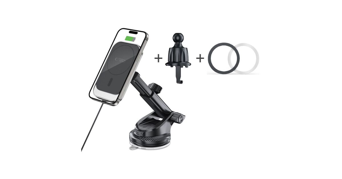 Autós tartó, univerzális, szélvédőre vagy szellőzőre vagy műszerfalra rögzíthető, 360°-ban forgatható, mágneses, Magsafe kompatibilis, Magsafe gyűrűvel, Qi vezeték nélküli töltővel, 15W, TP M