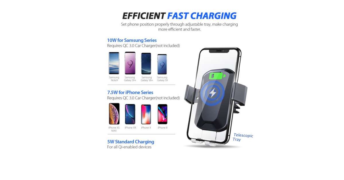 Ez a Qi vezeték nélküli autós töltő egyesíti a gyorstöltő funkcionalitását egy sokoldalú telefontartóval, így komplett megoldást nyújt a telefonod autóban való használatához.