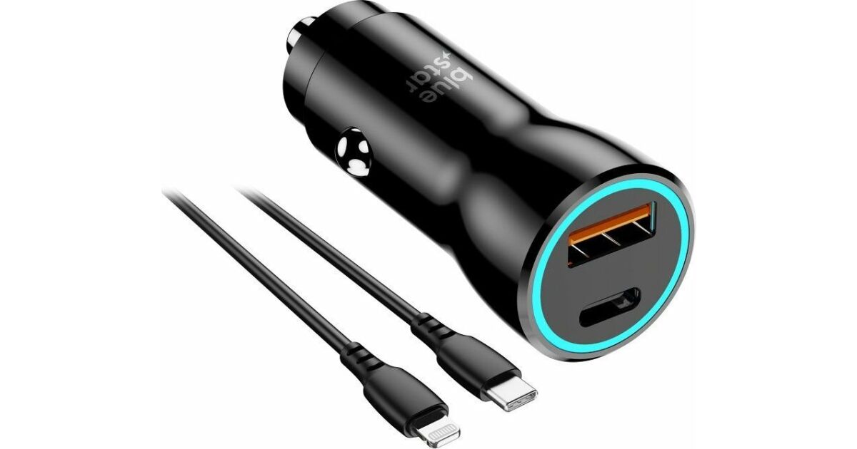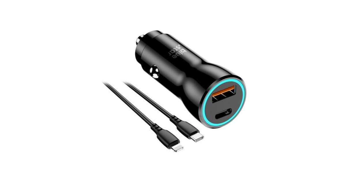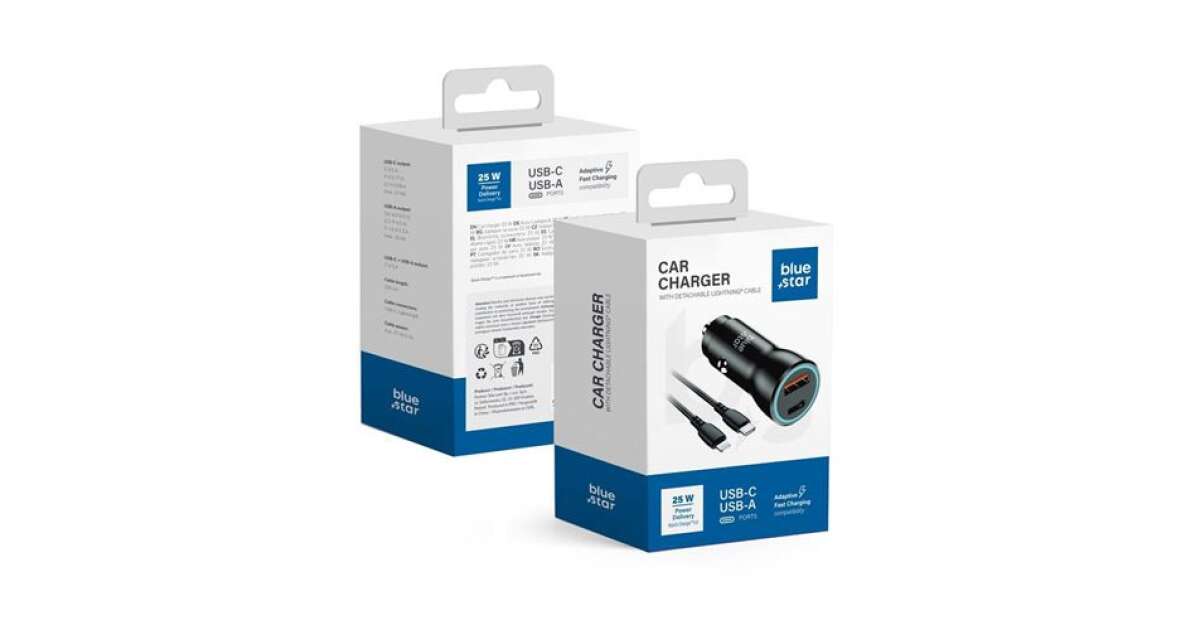 Ez a Blue Star 25W autós töltő tökéletes választás, ha útközben is szeretnéd gyorsan és biztonságosan tölteni eszközeidet. Két kimenettel rendelkezik: USB-C (PD 25W) és USB-A (QC 18W), így egyszerre több eszközt is tölthetsz. A csomagban egy USB-C - Lightning 3A adatkábel is található.