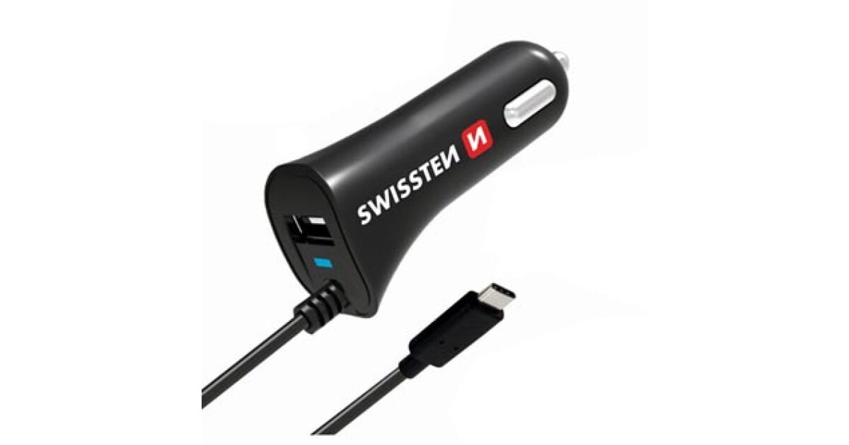 Swissten autós töltő USB-C kábellel, + 1 USB port, 2,4 A, fekete