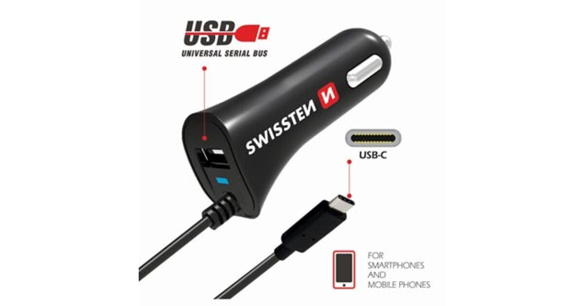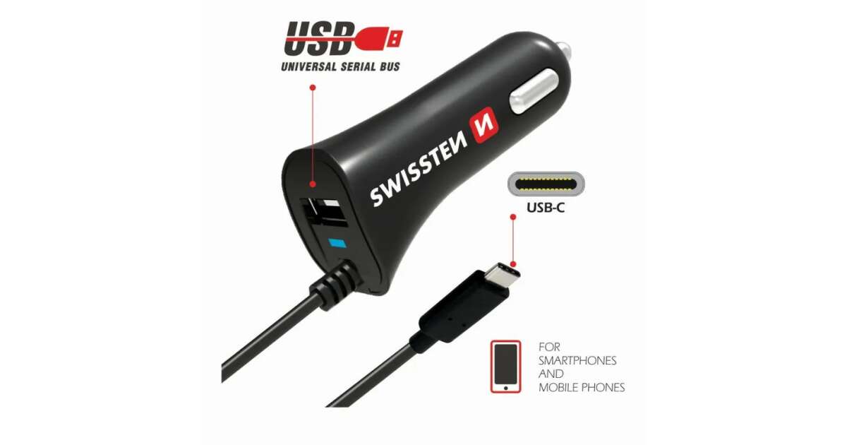 Swissten autós töltő USB-C kábellel, + 1 USB port, 2,4 A, fekete leírása