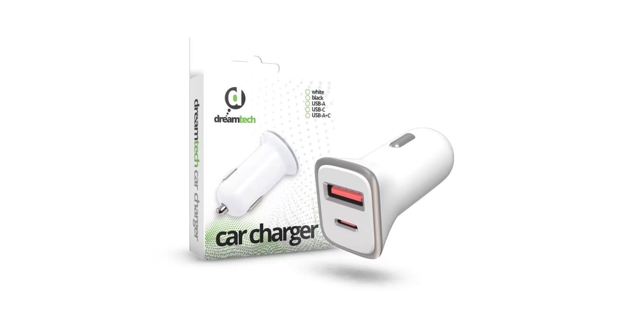 Dreamtech PD 18W FEHÉR Autós töltő Type-C + USB A csatlakozókkal