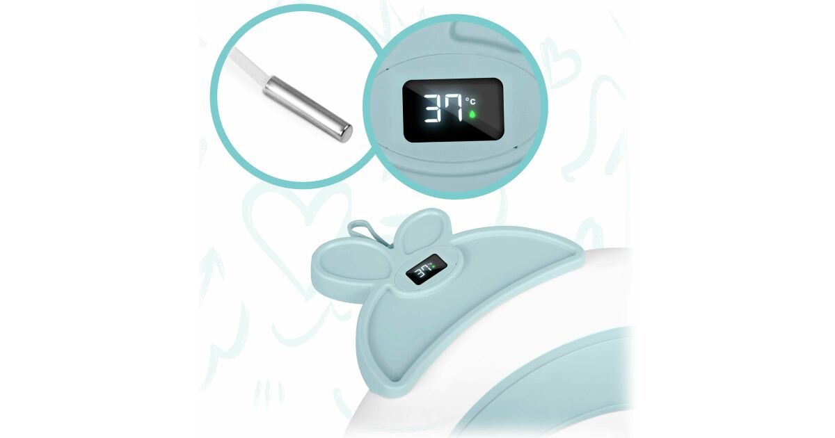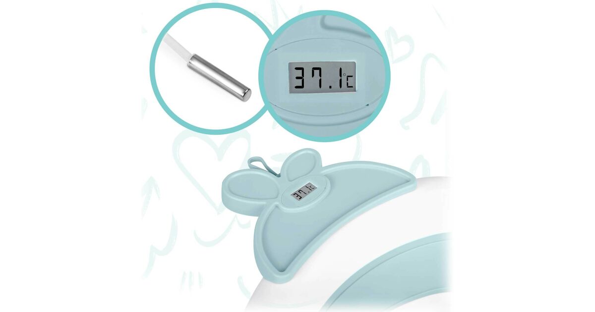 - Beépített hőmérő: Digitális LCD kijelzővel, pontos hőmérsékletméréshez. Az elem biztonságosan van elhelyezve, a baba nem fér hozzá.