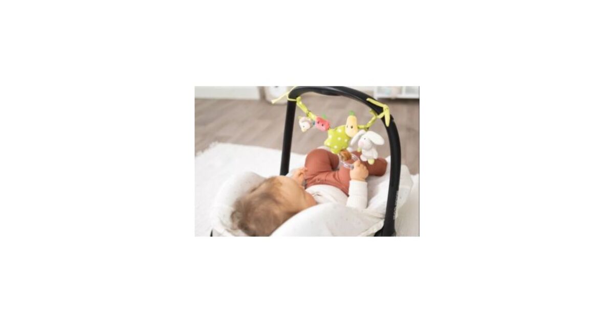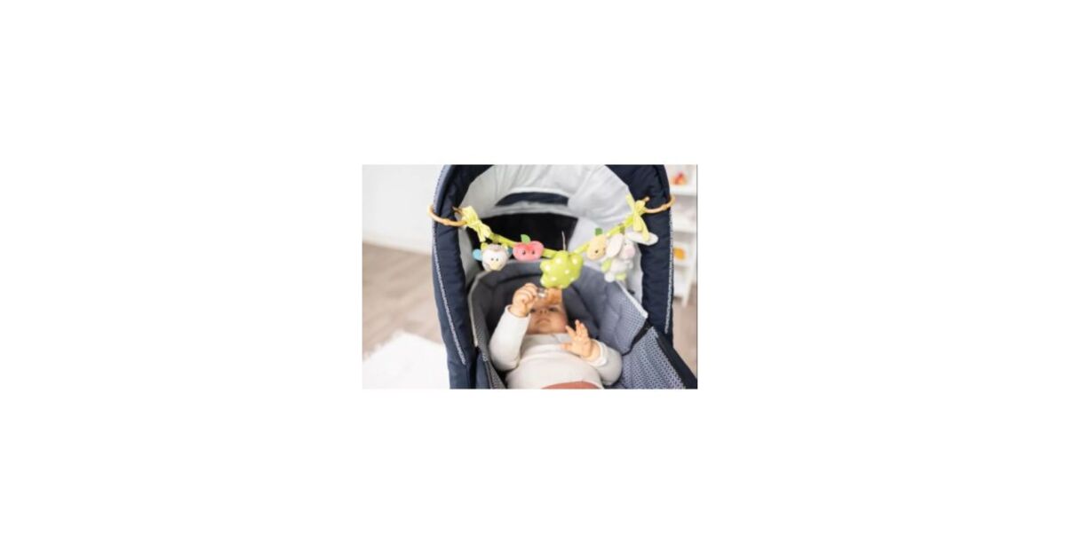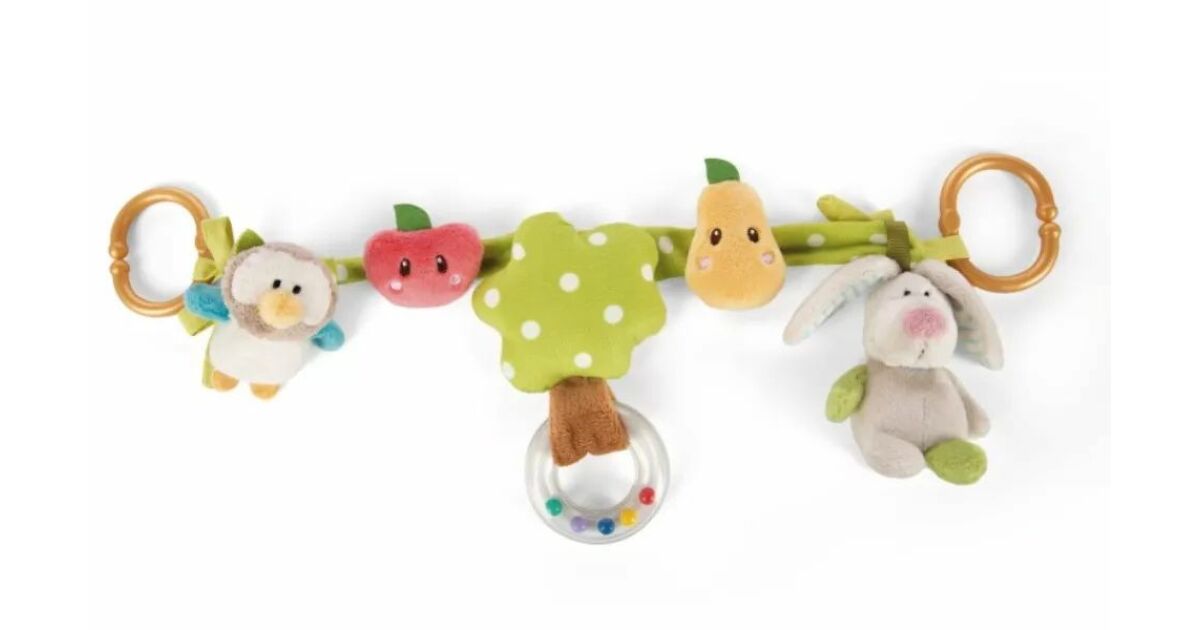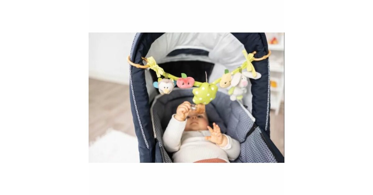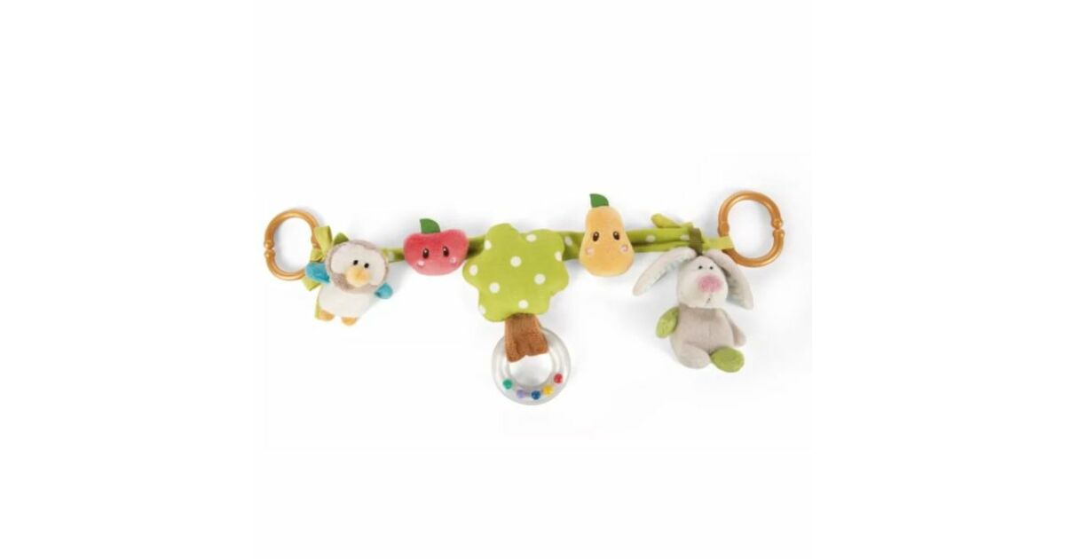 Ez a 40 cm hosszú babakocsi lánc 5 puha, 3D-s plüssfigurával vidámmá teszi a babakocsis sétákat, az autózást vagy az otthoni játékot. A csörgő bagoly, a sípoló nyuszi, a fogantyús fa és a két gyümölcs fejleszti a baba tapintását és megfigyelőképességét.