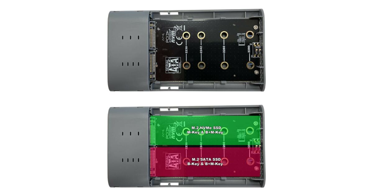 - Kompatibilitás: Támogatja az NVMe és SATA M.2 SSD-ket (M-Key, B+M-Key, B-Key).