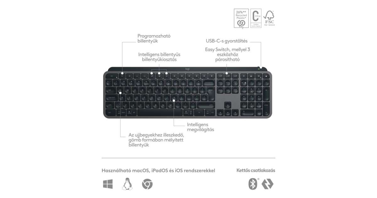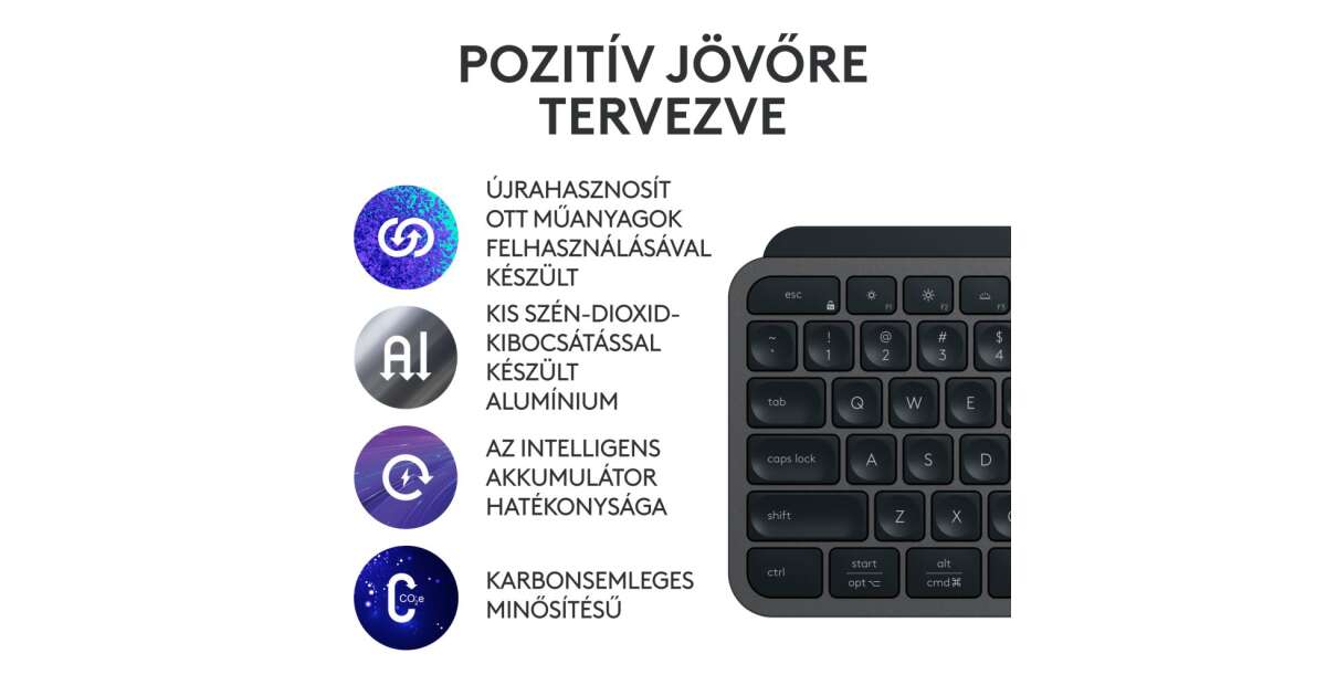 - Intelligens háttérvilágítás: A billentyűk automatikusan világítanak, amikor a keze közeledik, és a fényerő automatikusan alkalmazkodik a környezethez. A Logi Options+ alkalmazással testreszabható.
