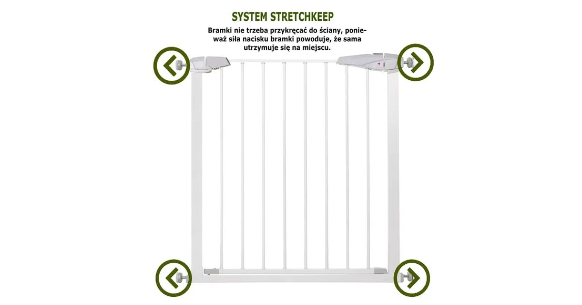 - StretchKeep rendszer: Falhoz rögzítés nélkül is stabil, a kapu nyomása tartja a helyén.