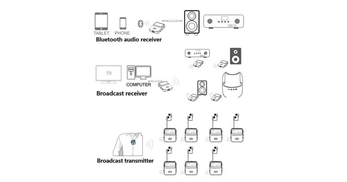 | Módok | Bluetooth adó, vevő, broadcast adó/vevő |