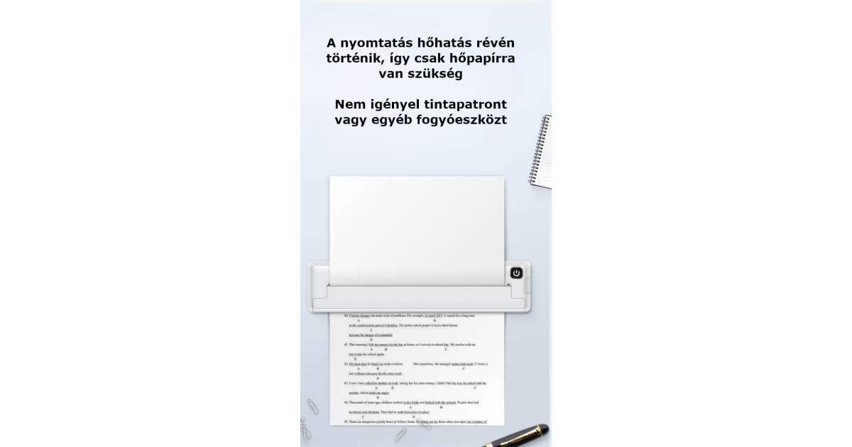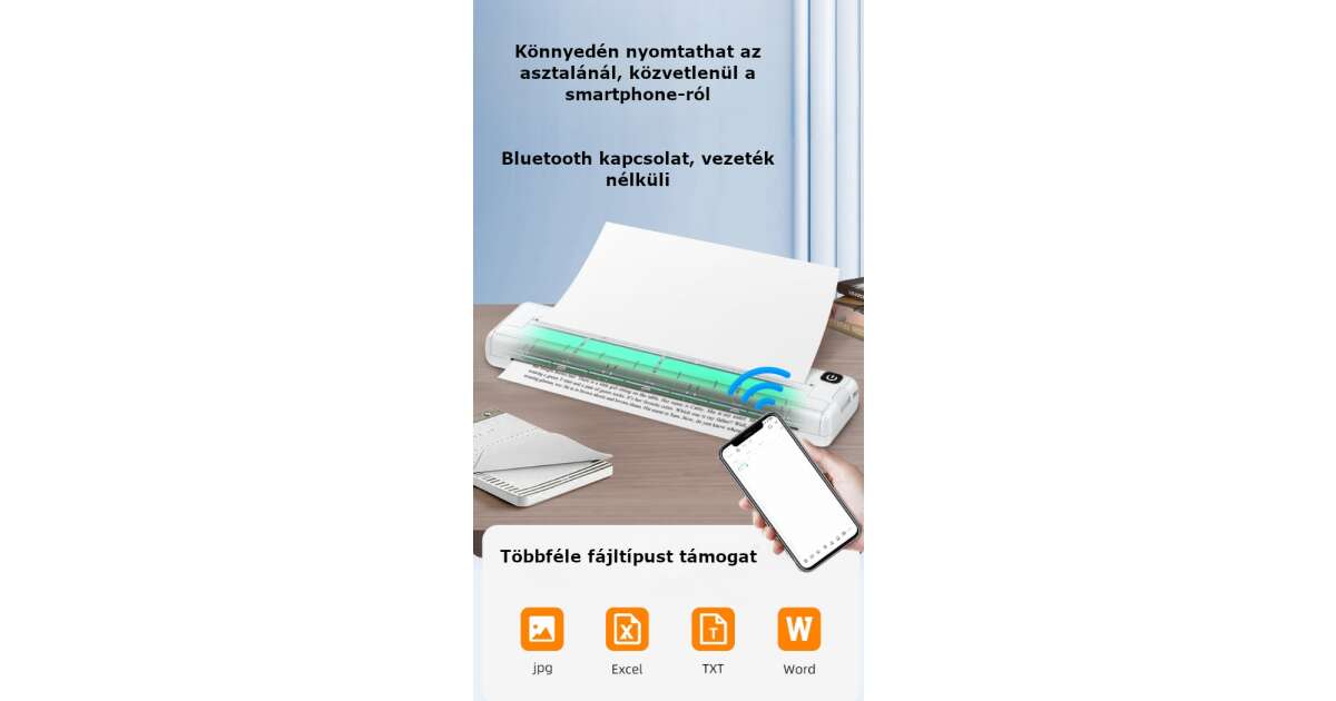 Ez az ultra hordozható hőnyomtató forradalmasítja a nyomtatást! Kicsi méretének köszönhetően könnyedén magaddal viheted bárhová, és bármikor, bárhol nyomtathatsz A4-es méretben. Nincs szükség tintára vagy tonerkazettára, csak speciális hőpapírra (100 lap a csomagban)! 🖨️