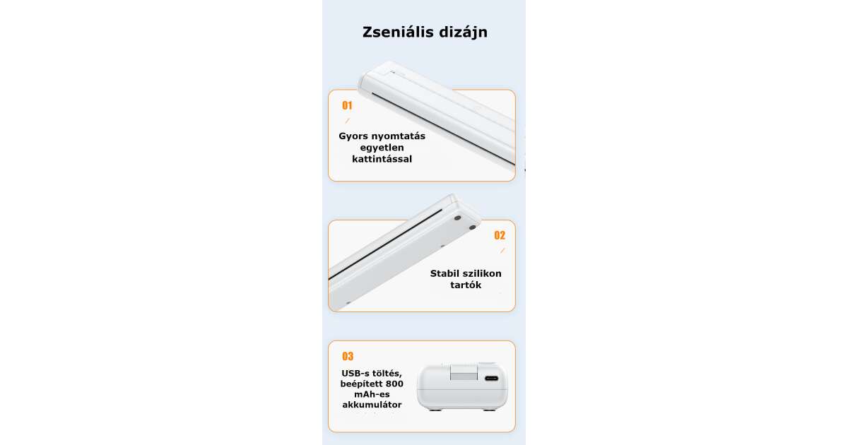- Nagy kapacitású akkumulátor: Kb. 100 oldal nyomtatására elegendő. (1000 mAh)