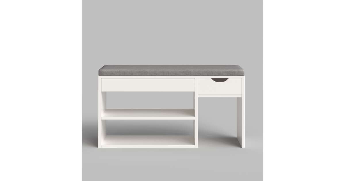 Ez a cipőstároló pad tökéletes választás a cipők rendszerezett tárolására és egy kényelmes ülőhely biztosítására is. A modern, fehér-szürke dizájn bármilyen előszobába vagy folyosóra illik. A beépített fiók extra tárolóhelyet biztosít, így kulcsokat, apróságokat is elrejthet benne.