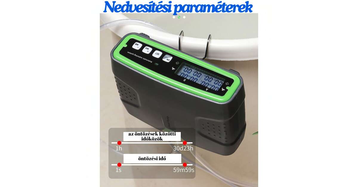 - Öntözések közötti idő: 1 órától 30 napig és 23 óráig állítható.