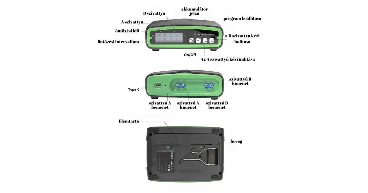 - Öntözési időtartam: 1 másodperctől 59 percig és 59 másodpercig állítható.