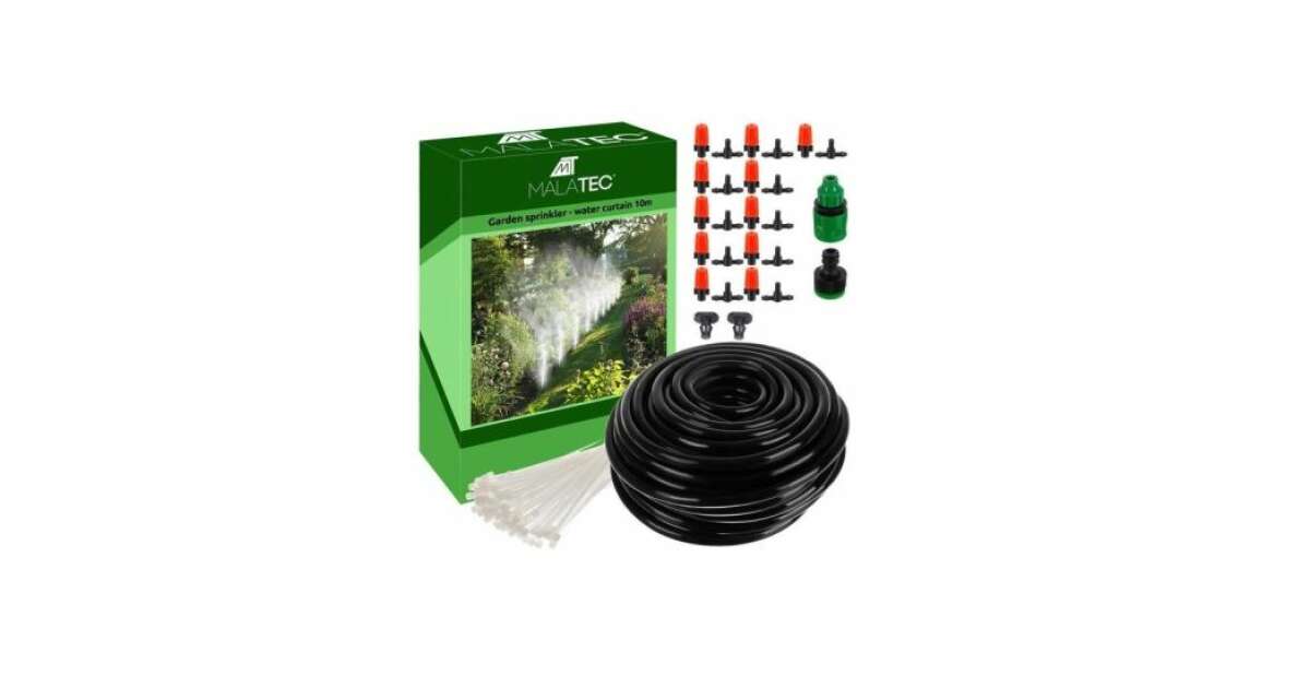 Élvezze a kellemesen hűsítő és párás környezetet a Malatec függöny szórórendszerrel! Ez a 10 méteres rendszer 11 fúvókával és 115 db rögzítővel garantálja a hatékony hűtést és öntözést. Ideális kertekbe, teraszokra, erkélyekre és nyaralók elé.