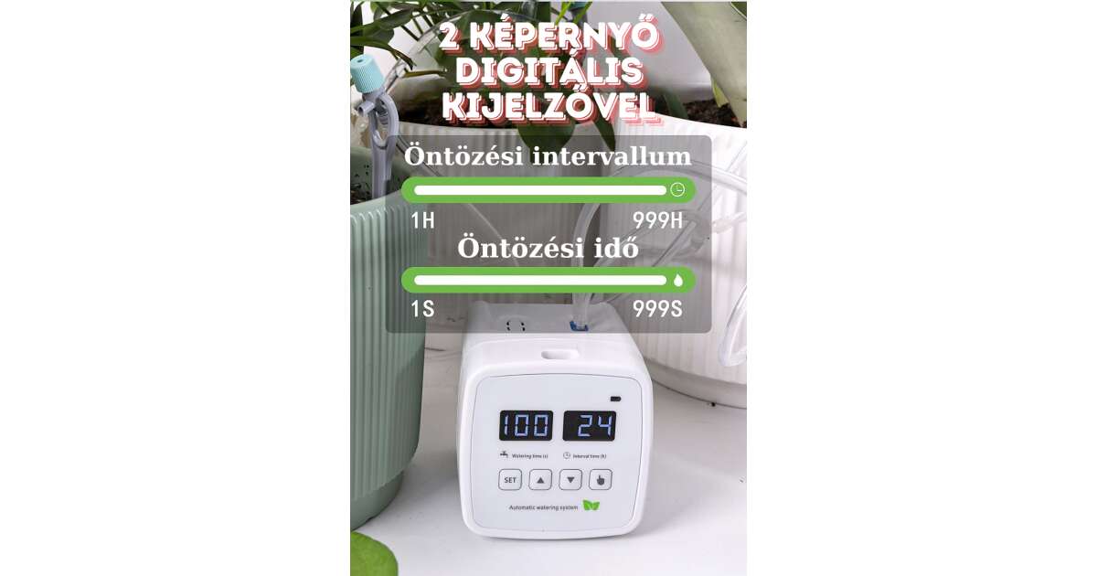 - Programozható öntözés: 1-999 óra közötti intervallum és 1-999 másodperc közötti öntözési idő beállítható. ⏱️
