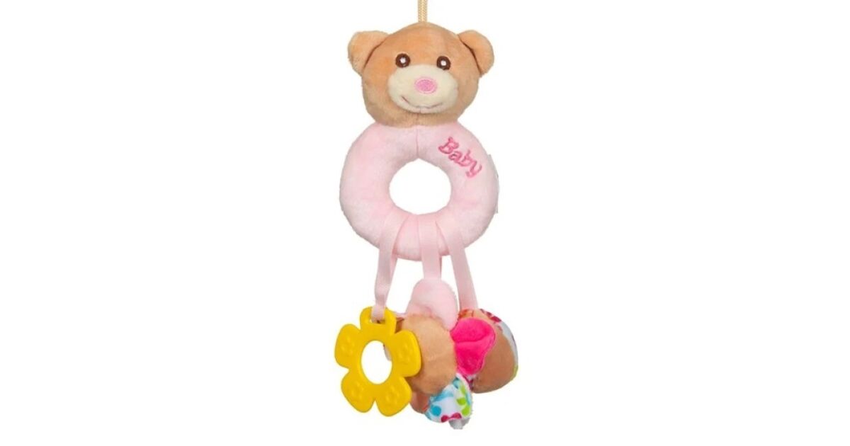 Gyermek 2 az 1-ben játék mackó, Csörgővel, Fogzáshoz, Rögzített formákkal, Plus, 25x9 cm, Rózsaszín leírása