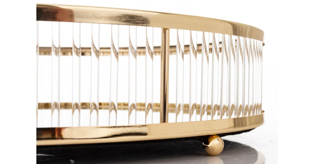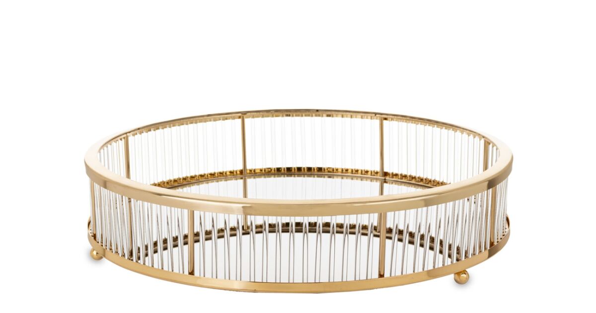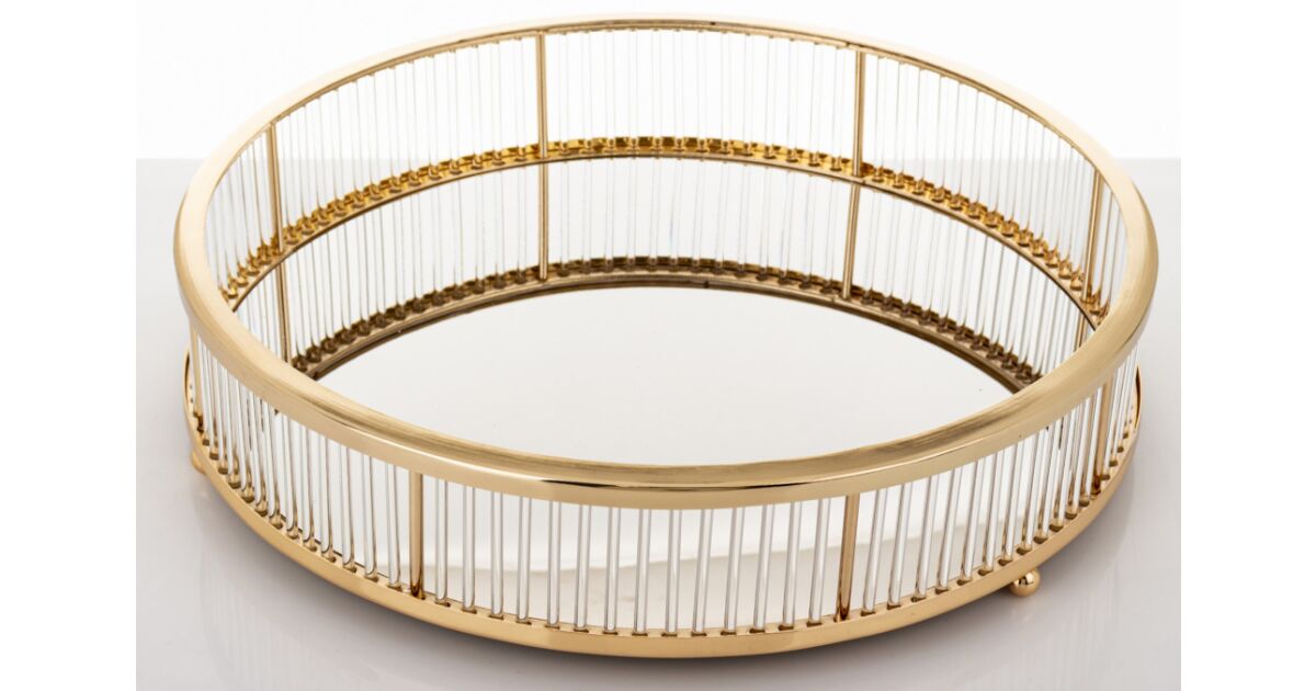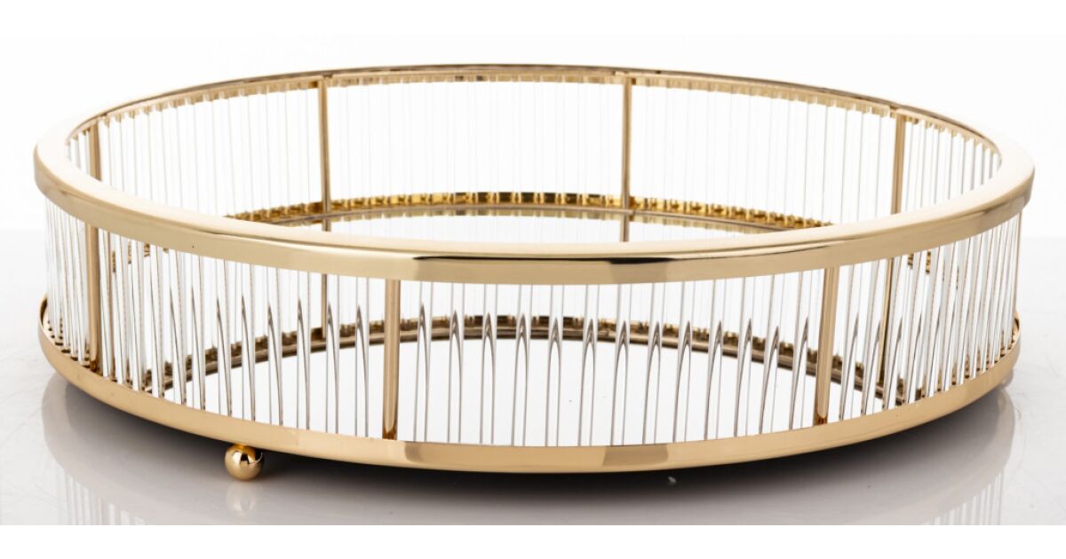 Ezt a terméket így is ismerheted: Glamour design kecses kerek sárgaarany fém tálca lábakon üvegfelülettel és díszítéssel 8x35x35cm
