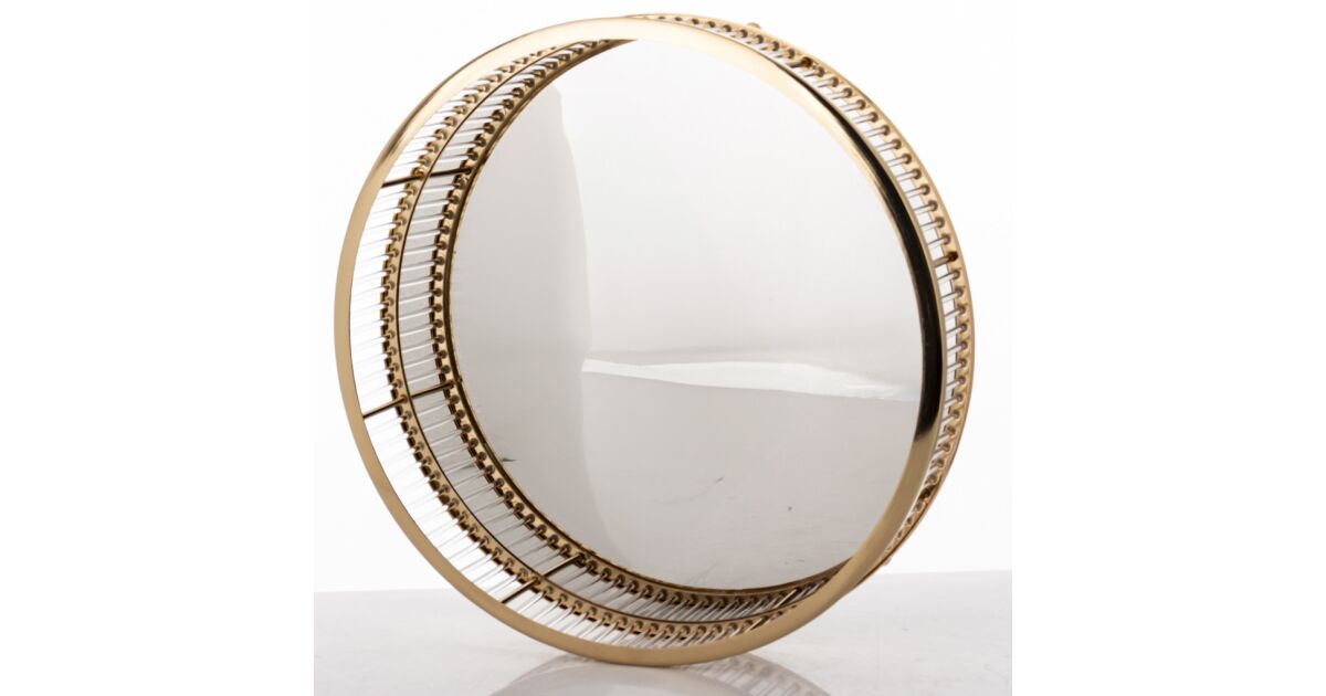 Ez a kecses, kerek, sárgaarany színű fém tálca üvegfelülettel és díszítéssel tökéletes választás, ha egy kis luxust szeretnél csempészni otthonodba. Stílusos megjelenésével bármely helyiség éke lehet.