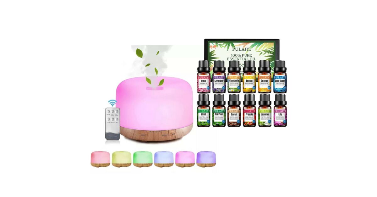 Ultrahangos Párásító és Aromaterápiás Diffúzor és Pulaiyi 12 db-os Illóolaj Szett