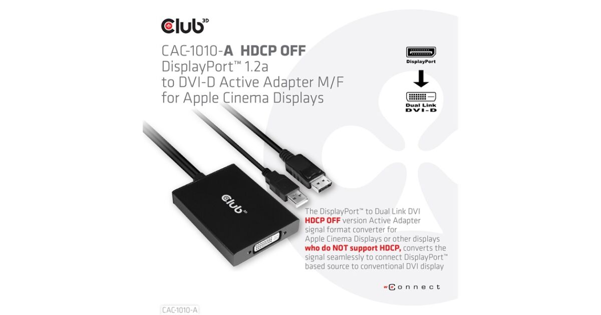 Ezt a terméket így is ismerheted: Club3D DisplayPort to Dual Link DVI-D HDCP OFF version Active Adapter M/F - Apple Cinema Kijelzőkhöz