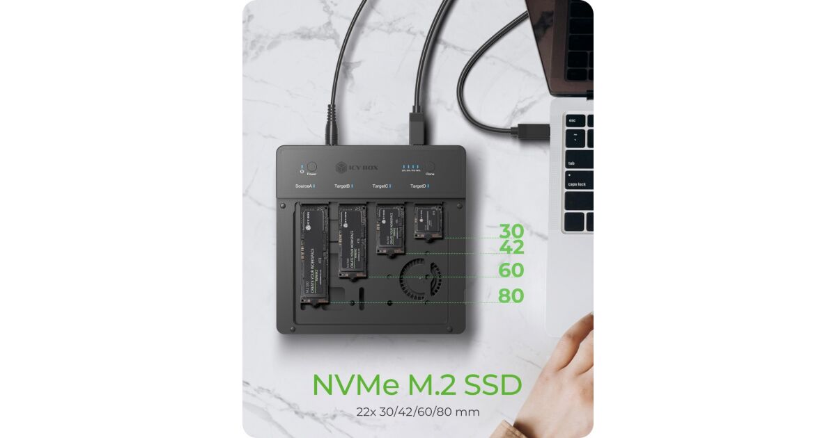 Gyorsítsa fel adatátviteli folyamatait és egyszerűsítse az NVMe M.2 SSD-k kezelését a RaidSonic ICY BOX IB-4013MCL-C4 dokkolóállomással! Ez a sokoldalú eszköz lehetővé teszi négy NVMe M.2 SSD egyidejű csatlakoztatását, klónozását és kezelését, mindezt villámgyors USB Type-C kapcsolaton keresztül.