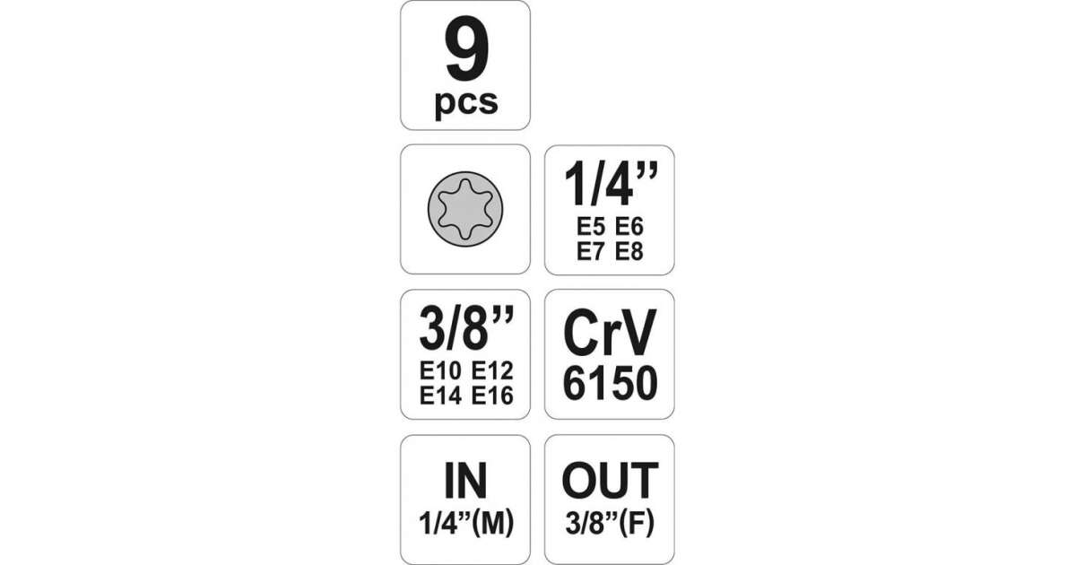 YATO Dugókulcs klt.9r TORX 1/4 col E5-E8 3/8 col E10-E16