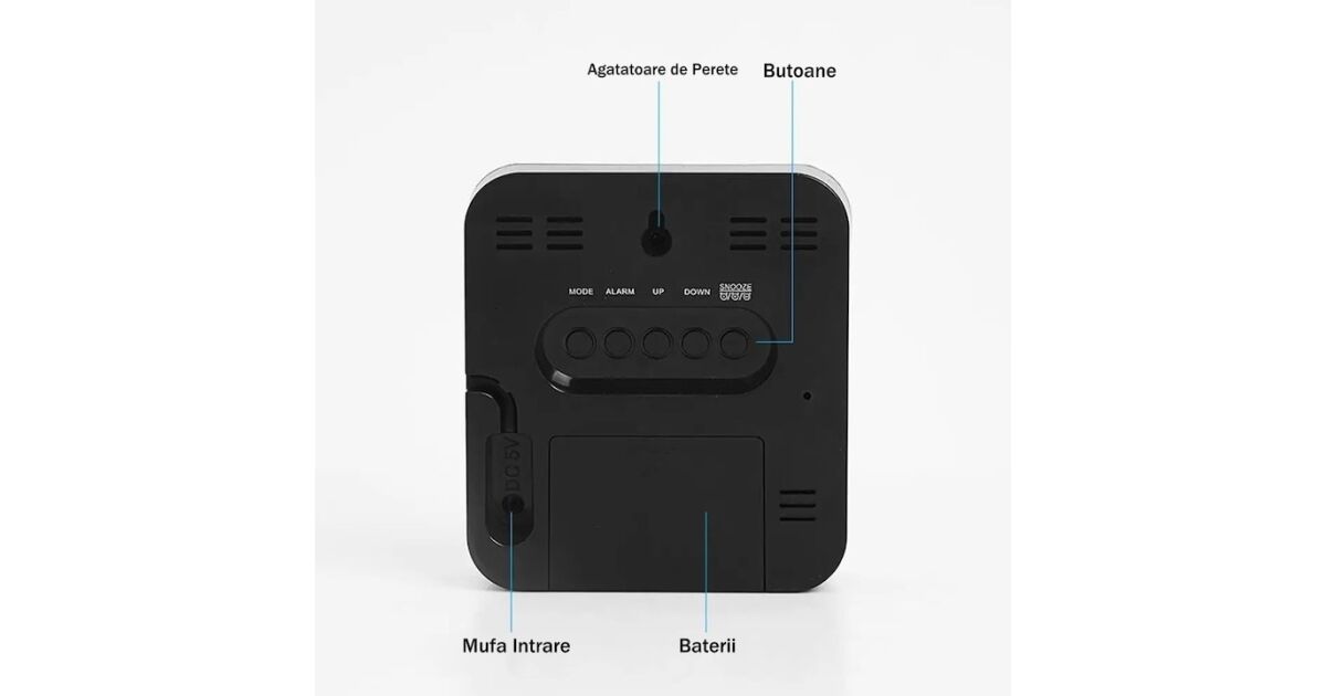 Ezt a terméket így is ismerheted: Ceas de masa, cu lumina led mov, incarcare USB, alarme, calendar, temperatura, functie snooze, mod de noapte, dimensiuni 11 X 10 X 4 cm, negru/mov