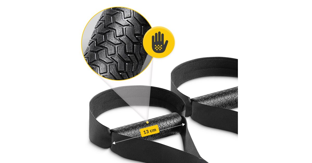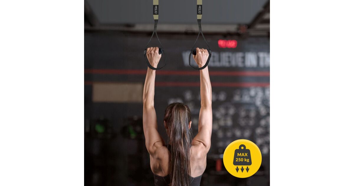 Ez a függeszkedő edzőszíj tökéletes választás a teljes testes erőnléti edzéshez, akár otthon, akár edzőteremben. A 250 kg-os maximális terhelhetőség garantálja a biztonságos és hatékony edzést. A kényelmes, habszivacs borítású fogantyúk biztosítják a kényelmes fogást, míg az állítható pántok lehetővé teszik a testmérethez való tökéletes illeszkedést.