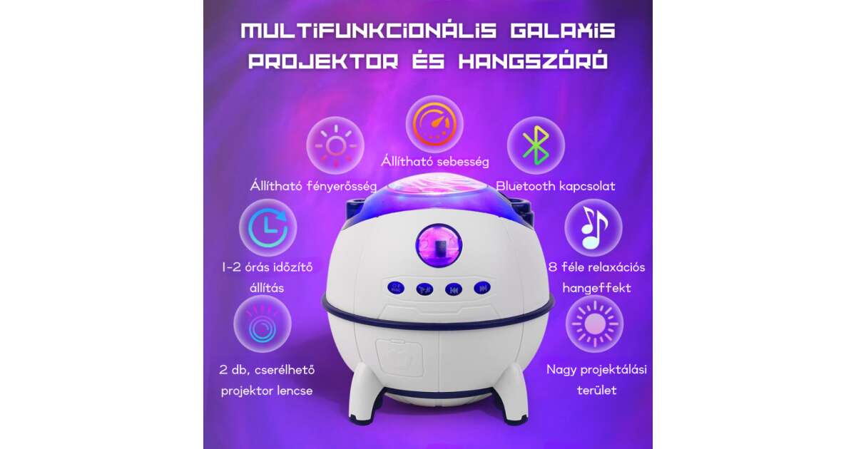 Állítsa be a hangulatot ezzel a multifunkcionális galaxis projektorral és hangszóróval, amely lenyűgöző fényjátékkal és relaxációs hangokkal varázsolja el Önt és családját. Ideális esti kikapcsolódáshoz, gyermekek altatásához, vagy romantikus hangulat megteremtéséhez.