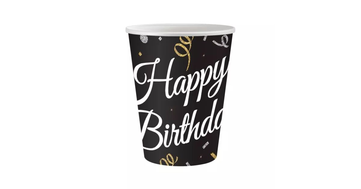 Ezek a vidám B&C Happy Birthday papír poharak tökéletesek a születésnapi partihoz! Elegáns fekete-arany dizájnnal és csillogó konfettivel díszítettek, hogy még ünnepibb hangulatot teremtsenek. 6 db 250 ml-es pohár található egy csomagban, így elegendő lesz minden vendégnek.