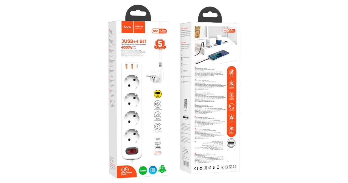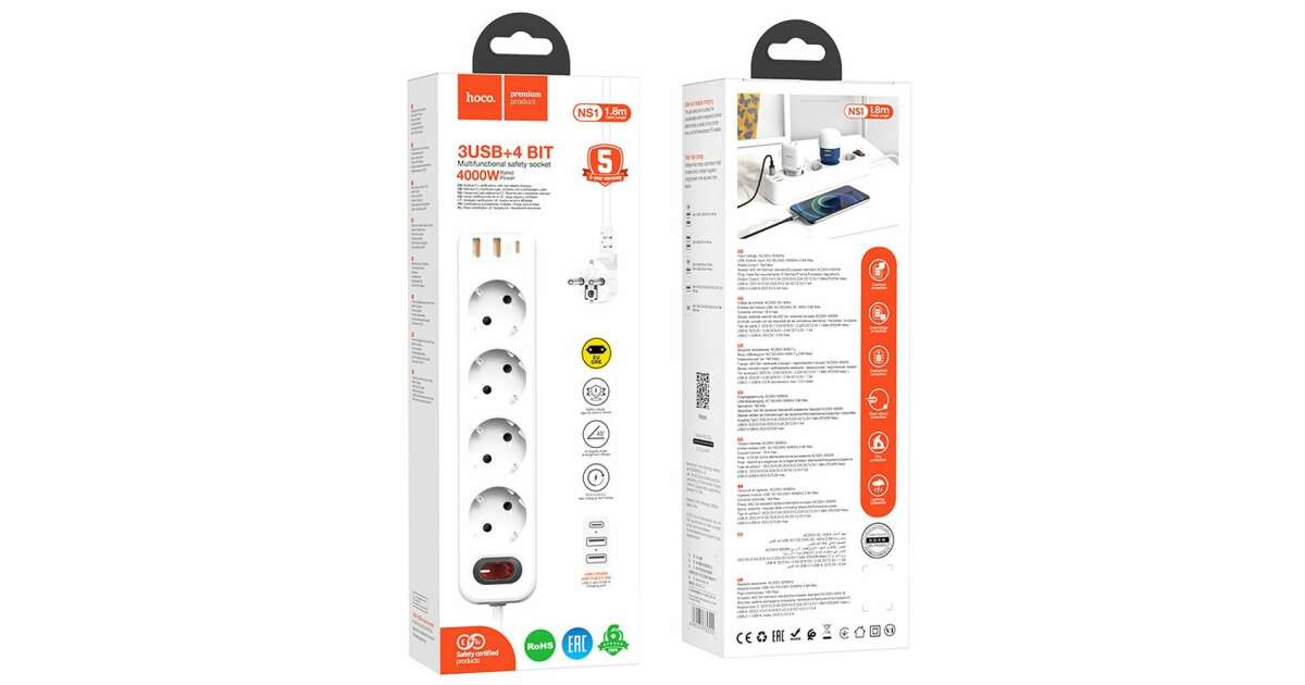 Ez a HOCO Aura NS1 elágazó tökéletes megoldás a mindennapi elektromos eszközök csatlakoztatására és töltésére. Négy szabványos aljzattal és két USB-A, valamint egy USB-C porttal rendelkezik, így egyszerre több eszközt is csatlakoztathatsz.