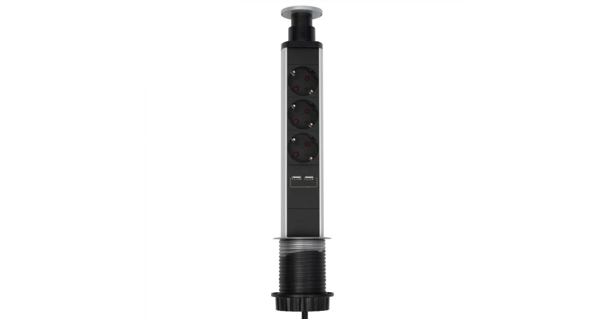 Ezt a terméket így is ismerheted: Home NVE 3/USB süllyesztett elosztó USB töltőaljzatokkal, 1,4 m, 3 földelt aljzat gyermekvédelemmel, asztalba, munkalapba építhető, süllyeszthető, max. 3680 W