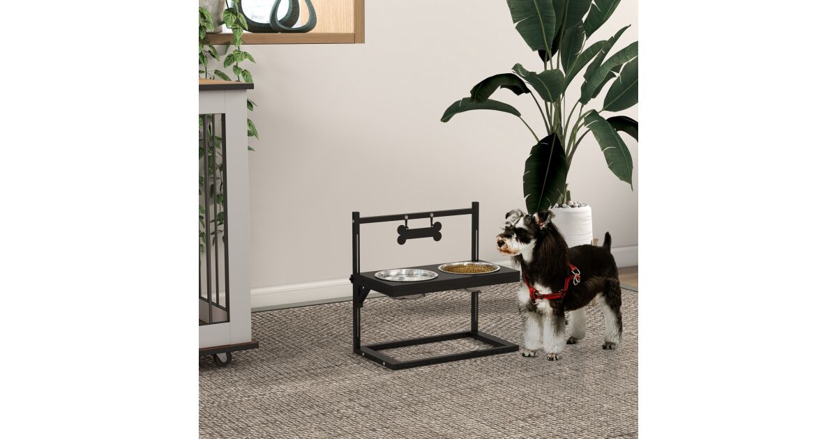 PawHut Állítható Magasságú Kutyatányér Állvány, 2 db 900 ml-es Acél Tál, Fekete
