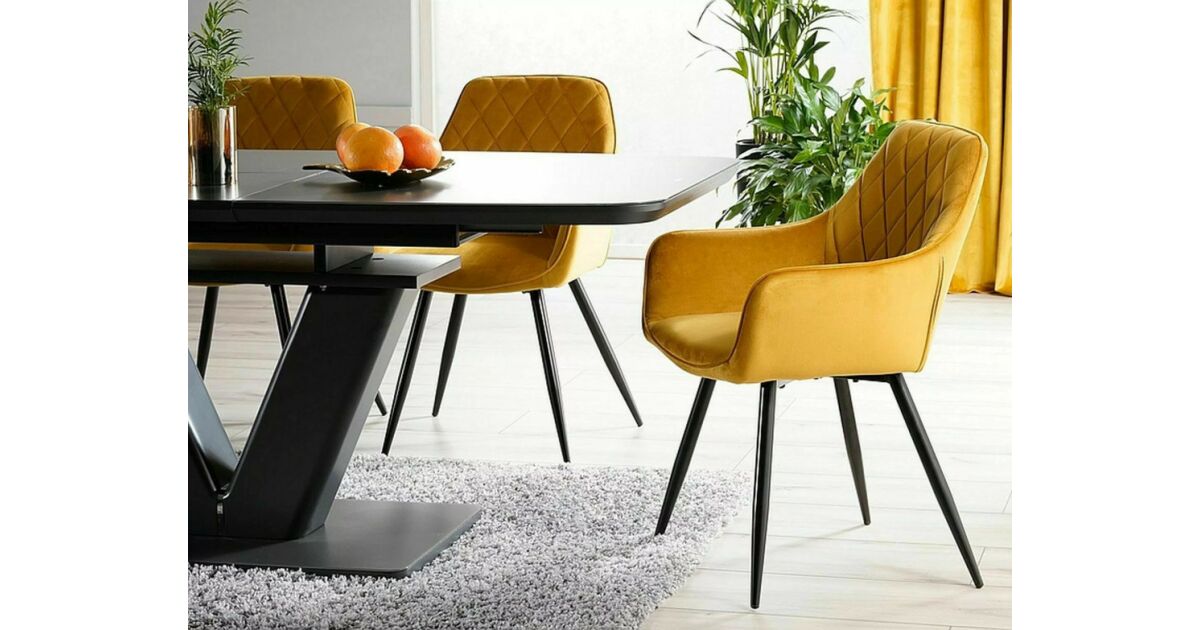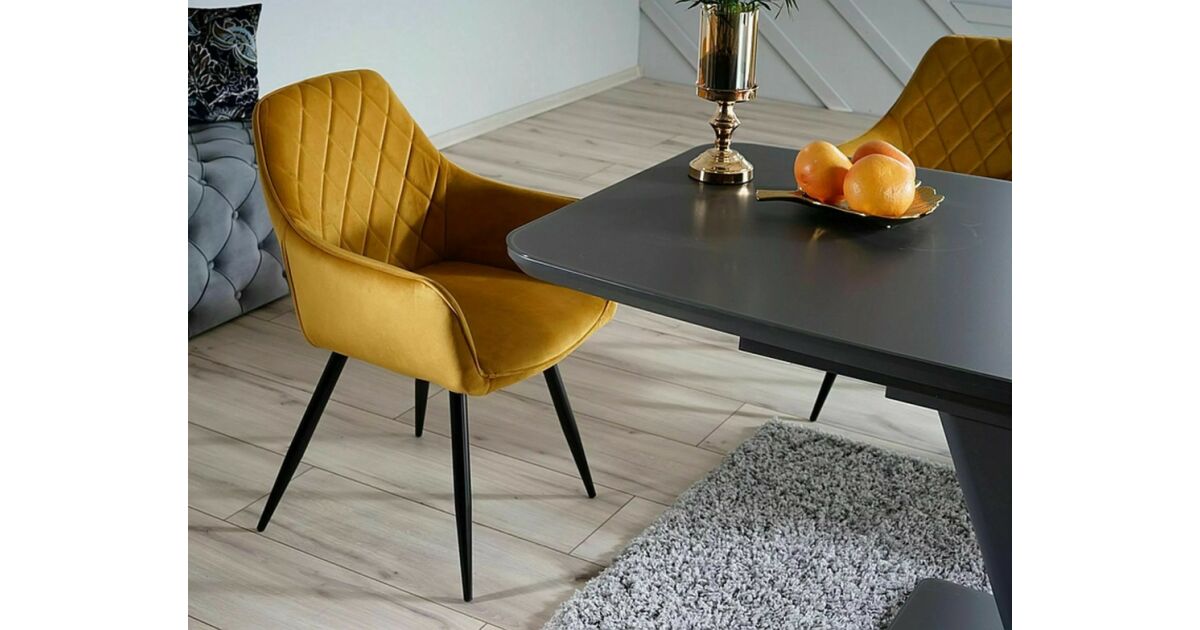 Ez a stílusos étkezőszék tökéletes választás, ha modern és elegáns bútorra vágysz, ami egyszerre kényelmes is. A bársony kárpitozás luxus érzetet kölcsönöz, a curry szín pedig vidám hangulatot visz az étkezőbe. A rombusz mintázatú háttámla egyedi megjelenést biztosít.