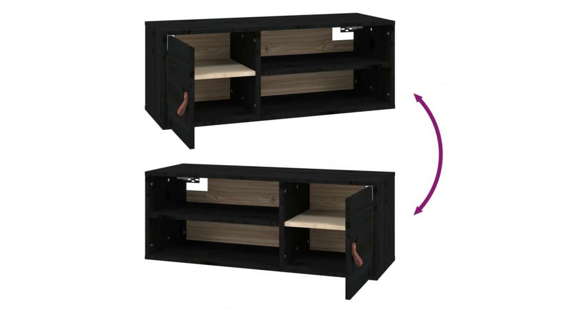 Ez a 2 db-os fekete fenyőfa faliszekrény szett stílusos és praktikus megoldást kínál otthona tárolási igényeire. A tömör fenyőfa rusztikus megjelenése melegséget és egyediséget kölcsönöz a helyiségnek. A rekeszek és az ajtók bőséges helyet biztosítanak könyveknek, DVD-knek, dísztárgyaknak és egyéb holmiknak.