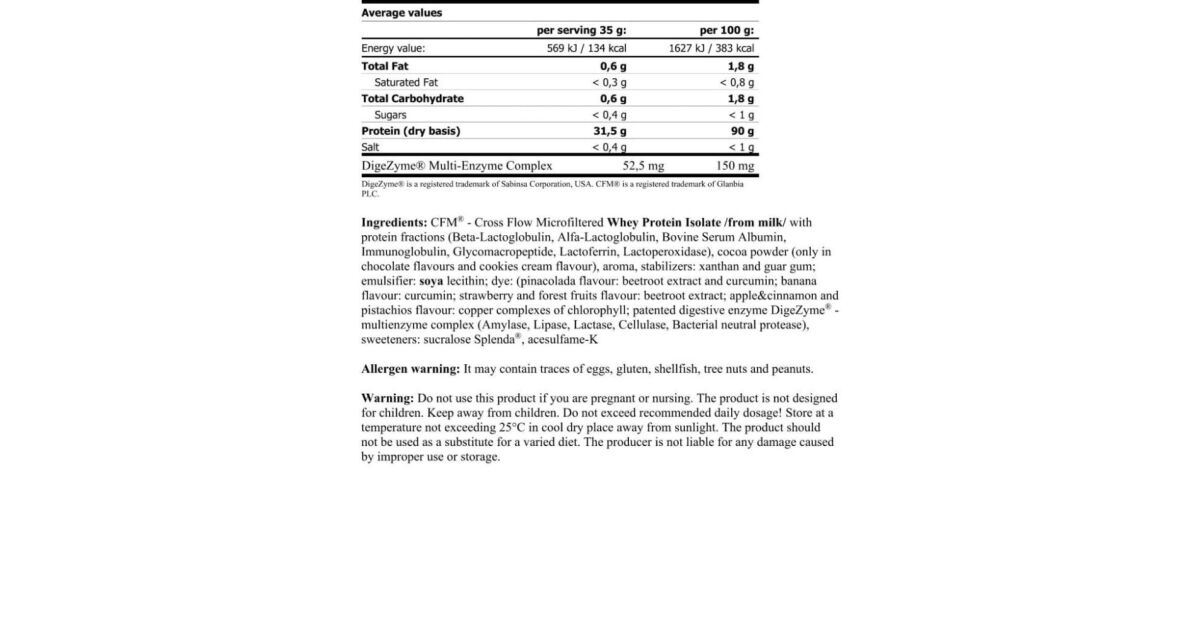 Összetevők: CFM® (Cross Flow Microfiltered Whey Protein Isolate) tejből; immunfrakciókkal (béta-laktoglobulin, alfa-laktoalbumin, Bovine Serum Albumin), Glycomacropeptide, Laktoferrin, Stabilizátorok (xantán gumi), kakaópor (csak a csokoládé ízben), aromák, édesítőszerek (szukralóz), emulgeátorok (szójalecitin), festék (karamell), savanyúságot szabályozó anyagok (citromsav), emulgeátorok (napraforgó lecitin), enzimek (Amylase, Lactase, Cellulase, bakteriális semleges proteáz), édesítőszerek (szukralóz Splenda®), aceszulfám-K.