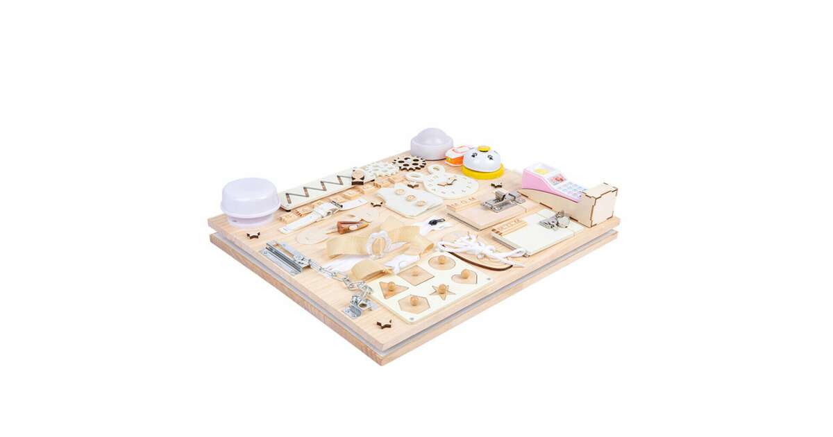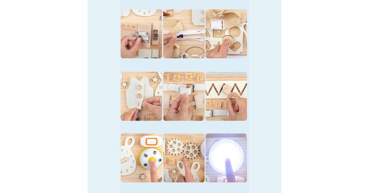 - Számos fejlesztő elem: cipőfűző, cipzár, gombok, reteszek, fogaskerekek, formák, számok, betűk - mindezek segítenek a finommotorika, a problémamegoldás és a kognitív képességek fejlesztésében.
