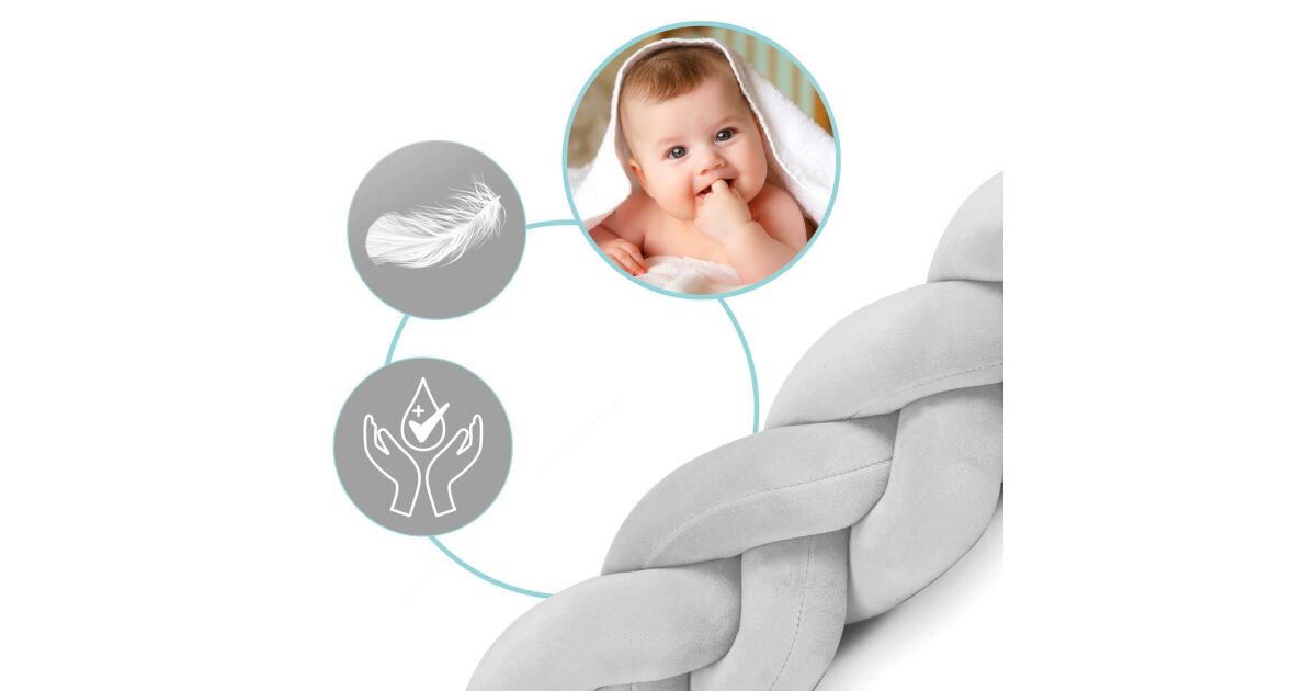 Ez a 3 méter hosszú, fonott kiságyrácsvédő puha, kényelmes és biztonságos védelmet nyújt babádnak a kiságy rácsai ellen. Véd a huzattól és a hideg faltól is, miközben segíti a babát a felülésben. A kellemes tapintású, antiallergén anyagból készült védő könnyen tisztán tartható, 30 fokon mosható.
