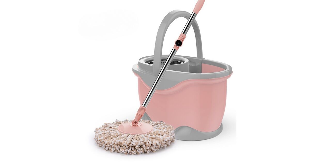360°-os forgatható vödör és felmosó készlet, Flippy, dupla centrifugális hatású, háztartási használatra, teleszkópos rozsdamentes acél fogantyú, 2 pamut fogantyú, 46x27x29 cm, rózsaszín